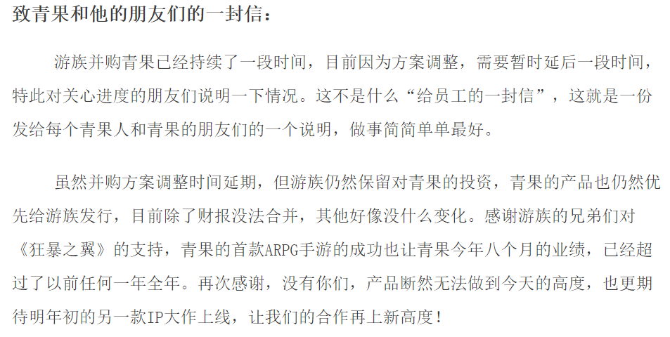 青果灵动CEO刘睿在公开信中回应:“并购方案调整时间延期,但游族仍然保留对青果的投资,青果的产品也仍然优先给游族发行,目前除了财报没法合并,其他好像没什么变化。”