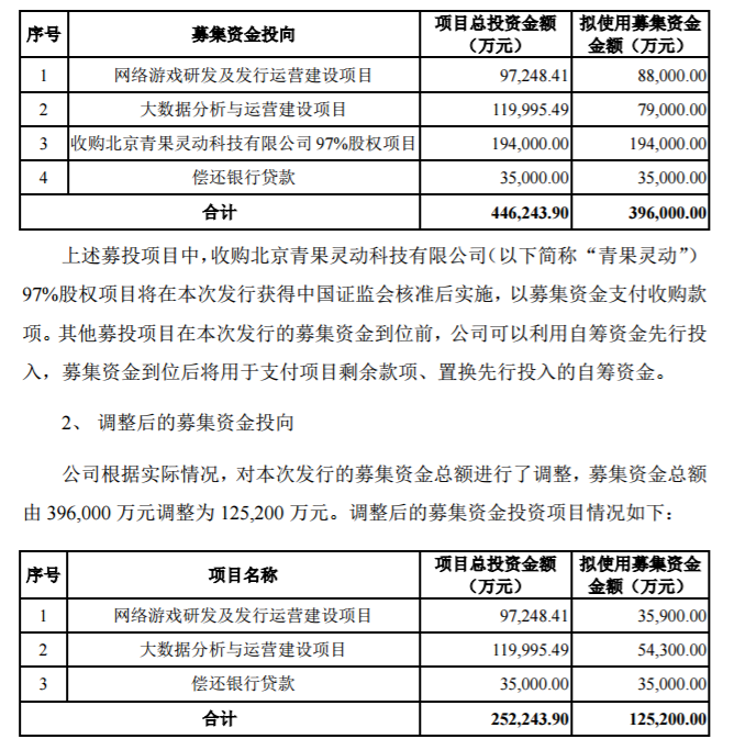 今年2月,游族网络宣布拟非公开发行总额不超过10000万股A股股票,募集资金总额不超过44.5亿元资金,拟用于网络游戏研发及发行运营建设项目、大数据分析与运营建设项目、收购青果灵动97%股权项目及偿还银行贷款。
