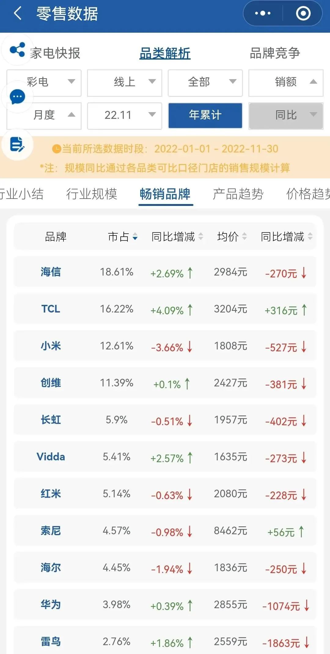 2022年,这一情况并没有发生明显改变。2022年1-11月创维在彩电线上市场的占有率为11.26%,依然排名第4。