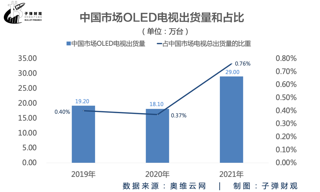 更关键的是,中国市场OLED电视出货量占国内电视总出货量的比例一直极低。根据奥维云网数据,2019年至2021年中国市场OLED电视出货量占国内电视总出货量的比重分别仅为0.40%、0.37%和0.76%,尚不足1%。