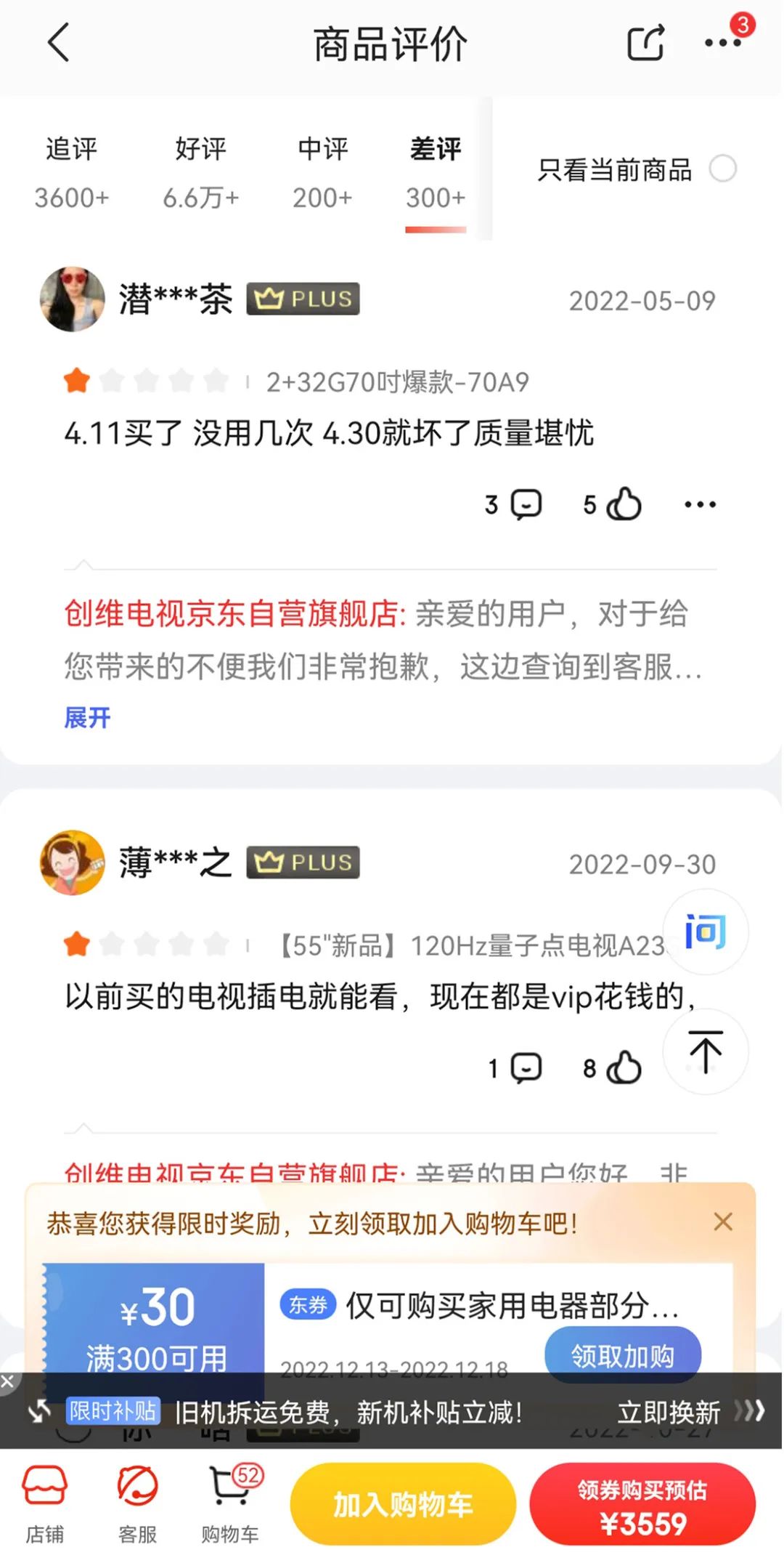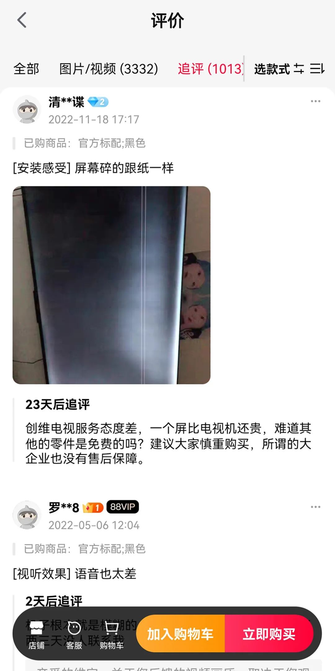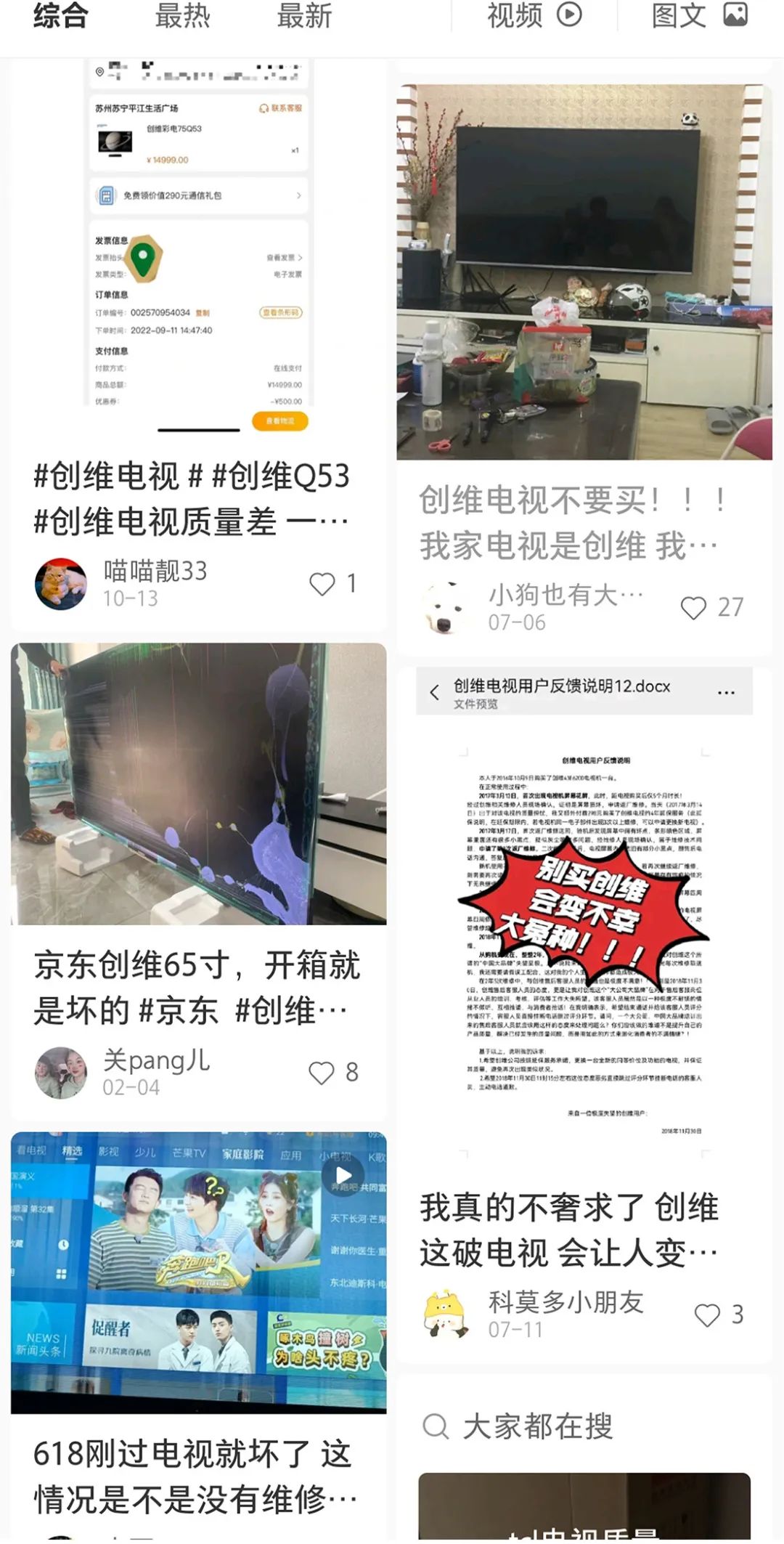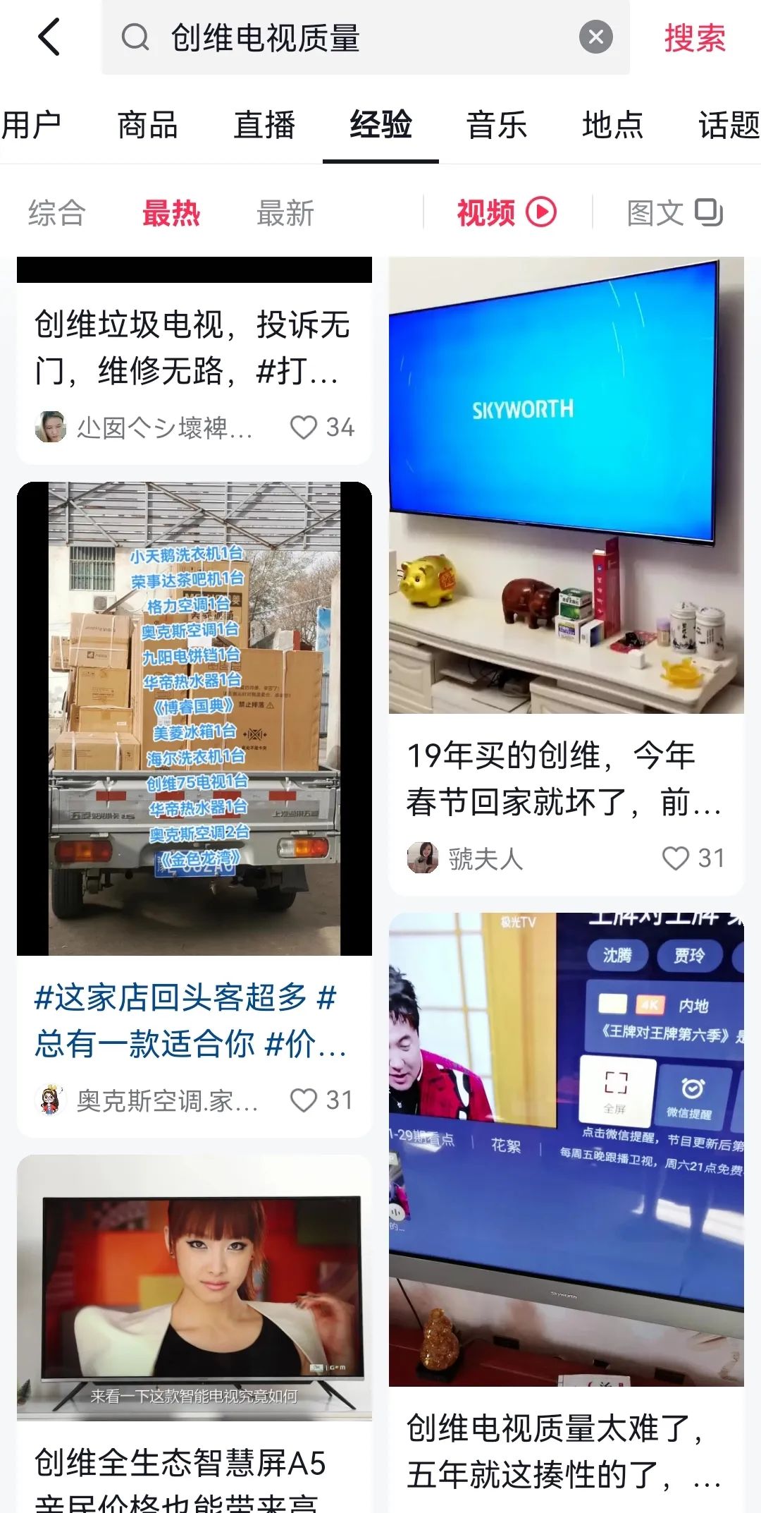 海内外销量下滑的同时,创维也没有维持好口碑信誉。「子弹财观」注意到,无论是在抖音、小红书等社交平台,还是在天猫、京东等电商平台,抑或是在黑猫投诉等投诉平台上,都有不少关于创维电视产品质量问题的投诉。