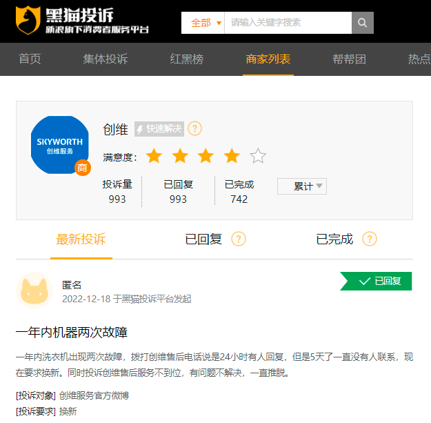 在黑猫投诉平台上,涉及创维的投诉合计达993条,而网友们对创维的投诉除了产品质量差,还涉及售后服务差、虚假宣传、霸王条款、不发货及不退款等。
