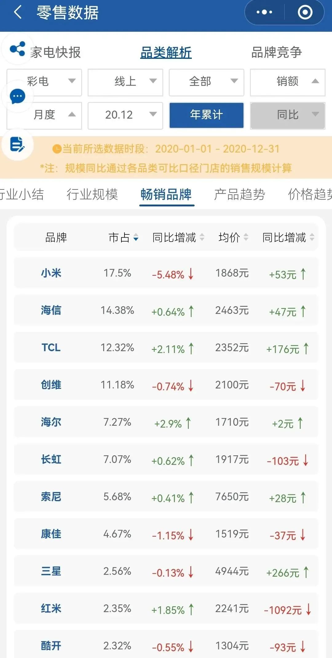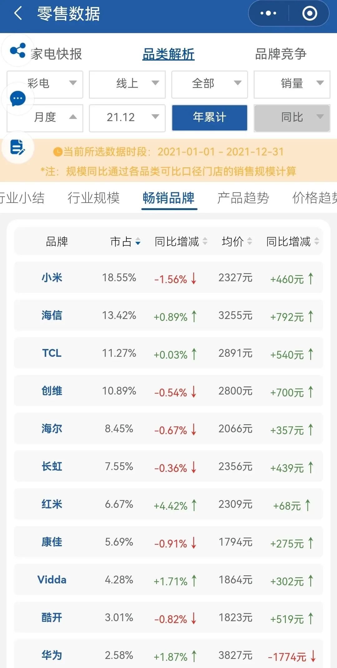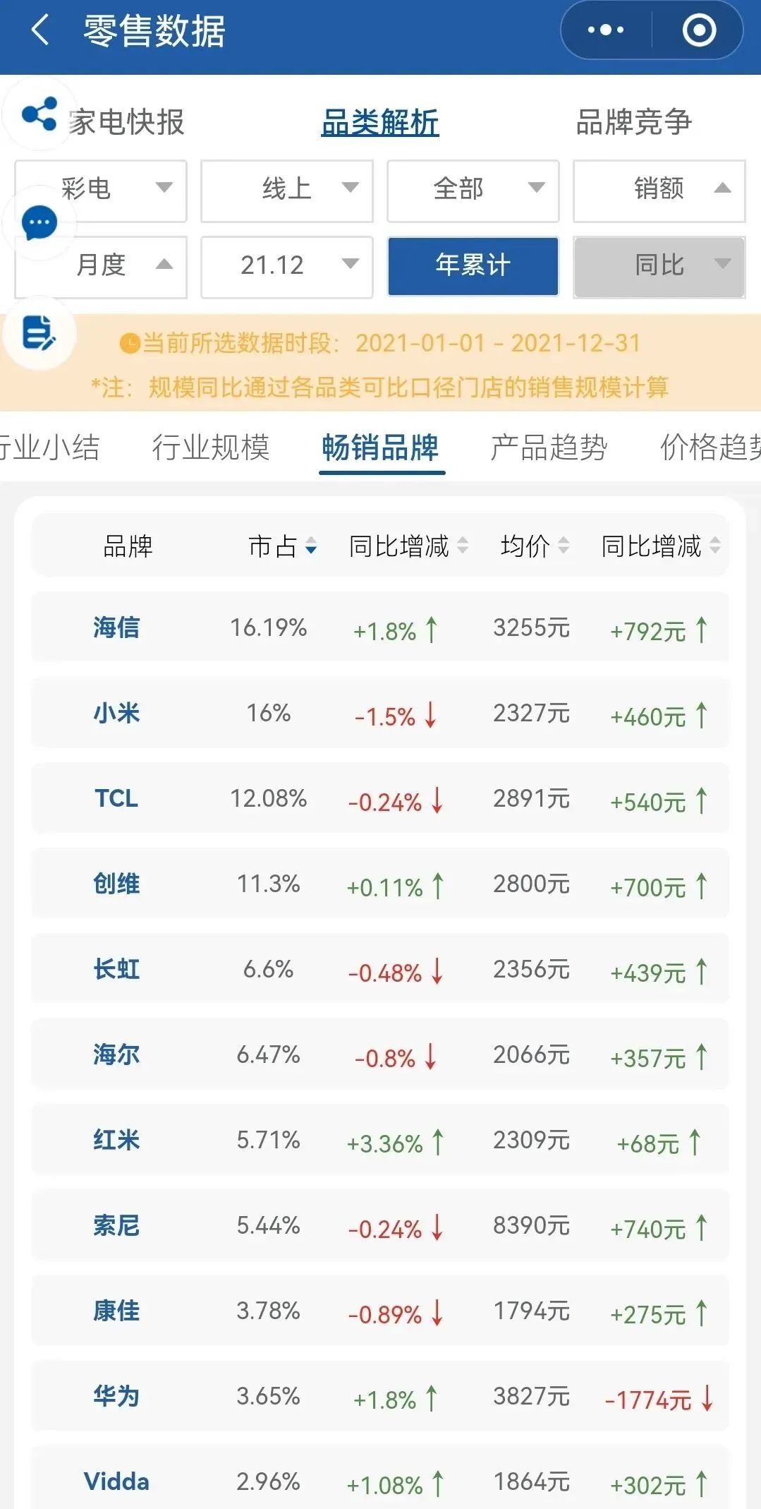 根据奥维云网数据,2020年创维在彩电线上市场的占有率为11.43%,排名第三,这距其拿到第一名的位置,只过去了4年的时间。到了2021年,这一数据进一步跌至10.89%,公司排名跌出前三,排名第四。