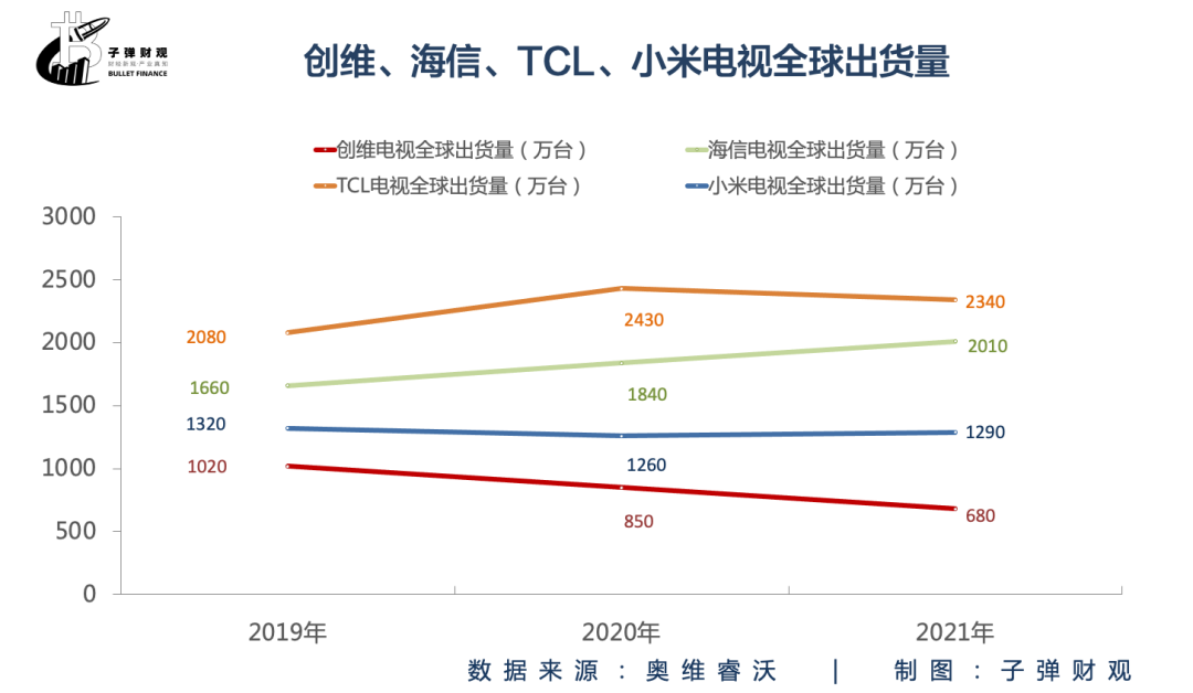 据奥维睿沃数据显示,2019年、2020年和2021年创维在全球的电视出货量分别为1020万台、850万台和680万台,呈逐年下滑的态势。而同期TCL这组数据分别为2080万台、2430万台和2340万台;海信为1660万台、1840万台和2010万台;小米为1320万台、1260万台和1290万台。