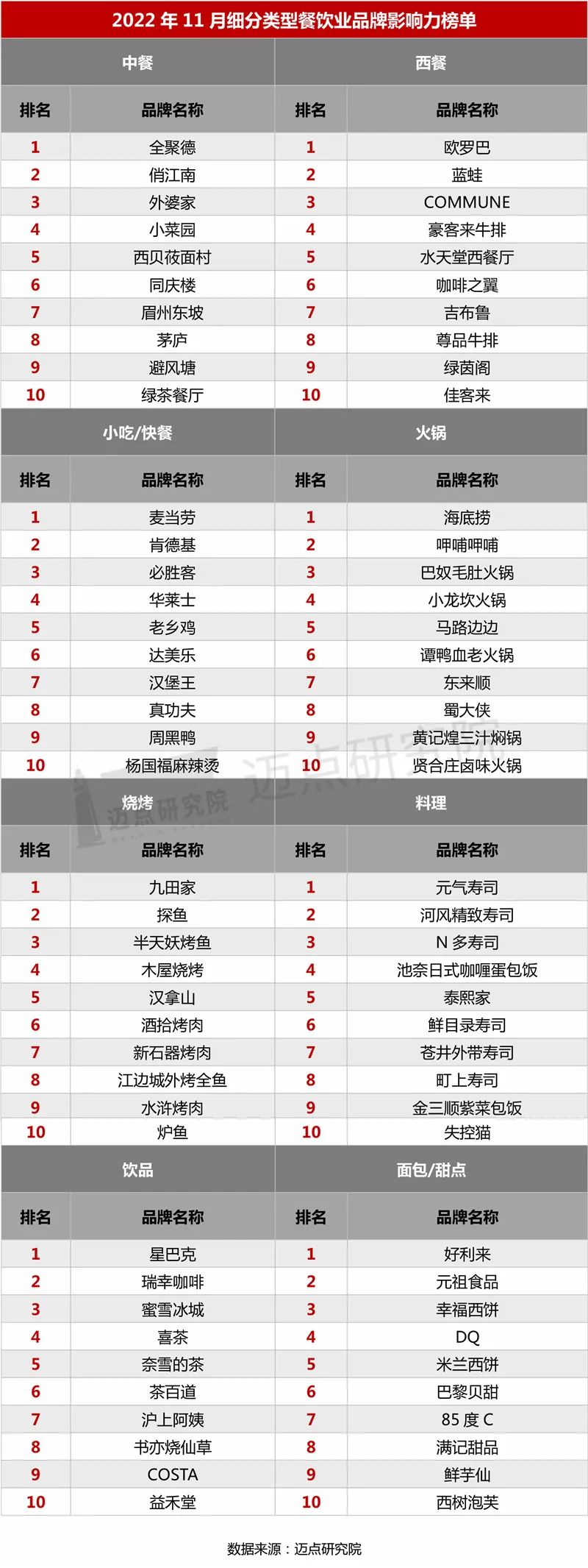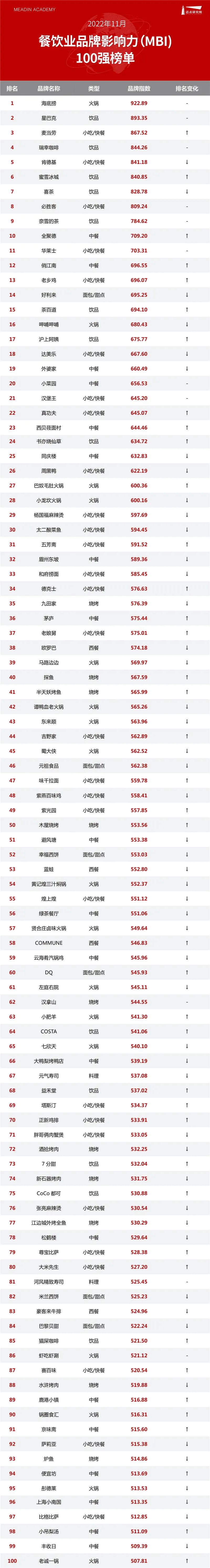 以下是迈点研究院独家发布的“2022年11月餐饮业品牌影响力(MBI)100强榜单”。本月海底捞、星巴克、麦当劳、瑞幸咖啡、肯德基、蜜雪冰城、喜茶、必胜客、奈雪的茶、全聚德进入榜单前十。TOP10品牌中,饮品品牌热度依然最高,占5席;其次是小吃/快餐品牌占3席,而火锅和中餐品牌各占1席。相比10月,本月100强榜单中,共有40个品牌排名上升,49个品牌排名下降,11个品牌排名没有变化。