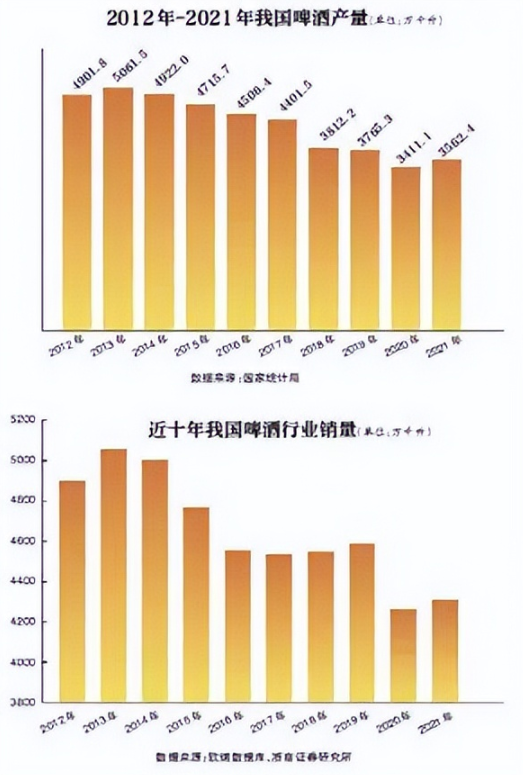 2020年受疫情影响,人们的饮酒习惯变成“宁愿喝少点,也要喝好酒”,中国啤酒销量当年为4269.4万千升,同比下降7.0%。于是酒企的产品结构升级,从缓和变得猛烈。