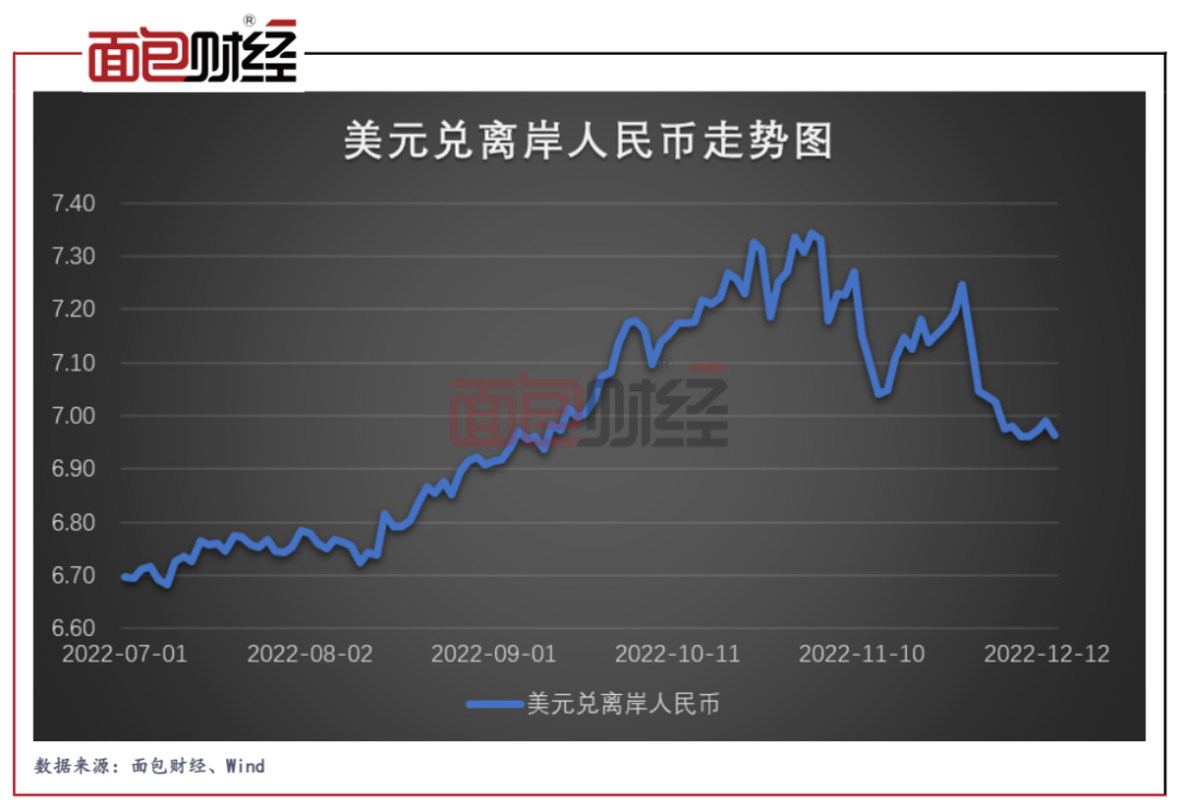 数据显示,离岸人民币汇率自2022年11月初迎来两波明显的升值行情。最新的一波升值起始于11月底,在5个工作日内,美元兑离岸人民币汇率从7.2以上快速修复至7以下。