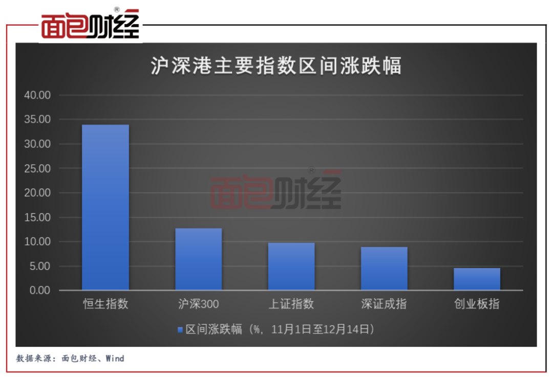 从股市表现来看,2022年11月以来,沪深港三地的股市均迎来反弹。截至12月14日,恒生指数期间反弹幅度达到33.95%、沪深300指数也反弹了12.72%。