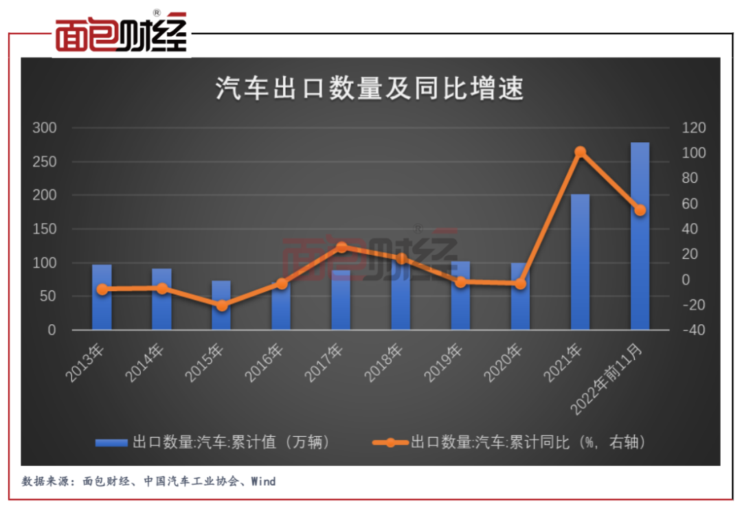 数据显示,自2021年以来,我国汽车出口呈现爆发式增长。根据中国汽车工业协会数据,2021年,我国汽车出口数量同比翻番;2022年前11个月,我国汽车企业出口278.5万辆,同比增长达55.3%。其中乘用车出口225.1万辆,同比增长57.8%;新能源汽车出口59.3万辆,同比增长1倍。