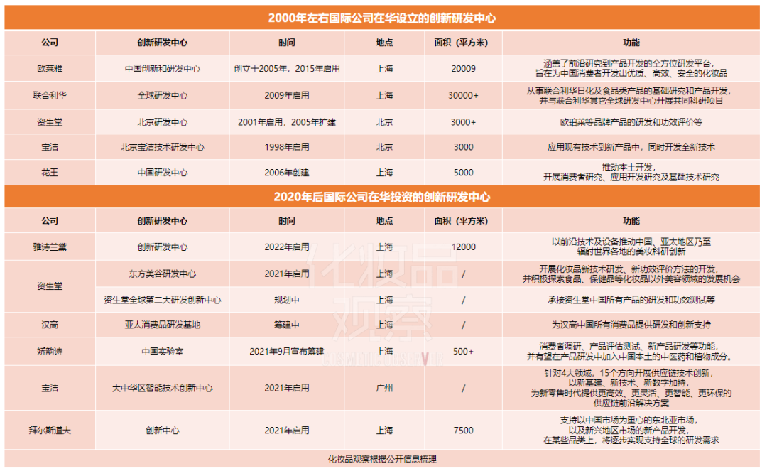 而国际巨头对在华研发中心的投入,并不是近些年才开始的。从最早1990年代宝洁在中国重金投入建设研发中心开始,国际美妆巨头在中国建设研发中心经历了两个高峰期,第一波投资高峰出现在2000年前后,第二波高峰则出现在2020年后。