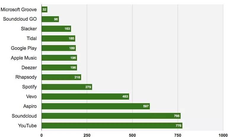 从条形图也可以看出,Spotify、Apple Music、Deezer、Rhapsody、Tidal、Google Play及Vevo等等音乐流媒体平台则处在了中间位置。由此可见,同一首歌在不同平台的“待遇”还是有着天壤之别。
