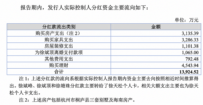 根据问询函的回复公告,徐天松父子三人所取得的分红资金,主要用于购置房产、房租装修、购置家具以及购买理财等用途。