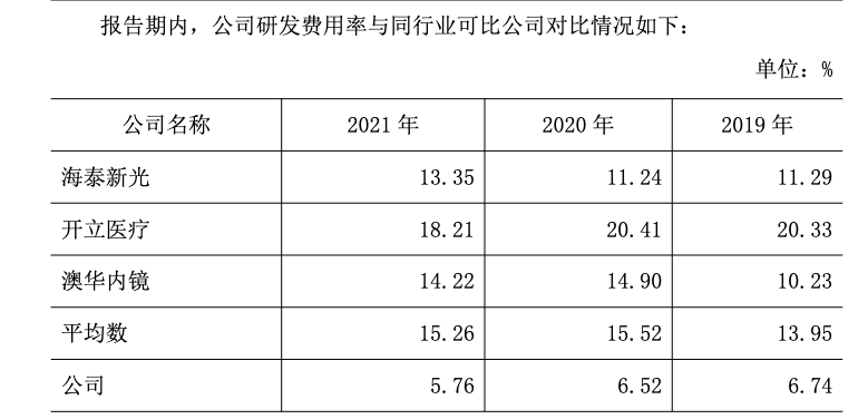 此外,天松医疗与海泰新光、开立医疗、澳华内镜等可比公司相比,天松医疗的研发费用率要显著的低于同行。