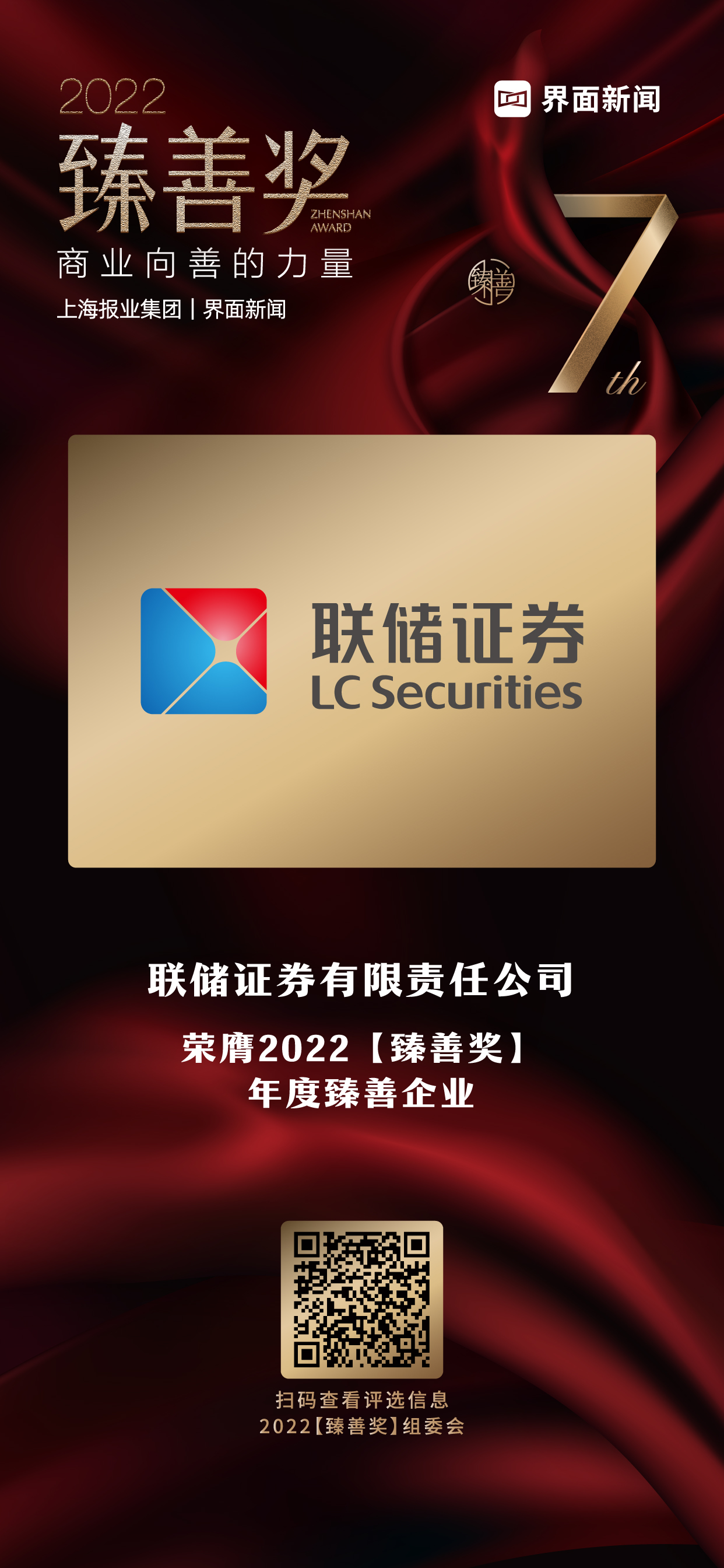 12月21日,上海报业集团 | 界面新闻在上海中心举办了2022【臻善奖】颁奖典礼,并正式公布了本年度获奖名单。聚“商业向善”之力,本届【臻善奖】吸引了一大批在公益慈善领域有所贡献的优秀企业和公益人士参与。联储证券有限责任公司凭借其坚持创造价值,秉承金融向善的CSR实践,荣膺年度臻善企业。