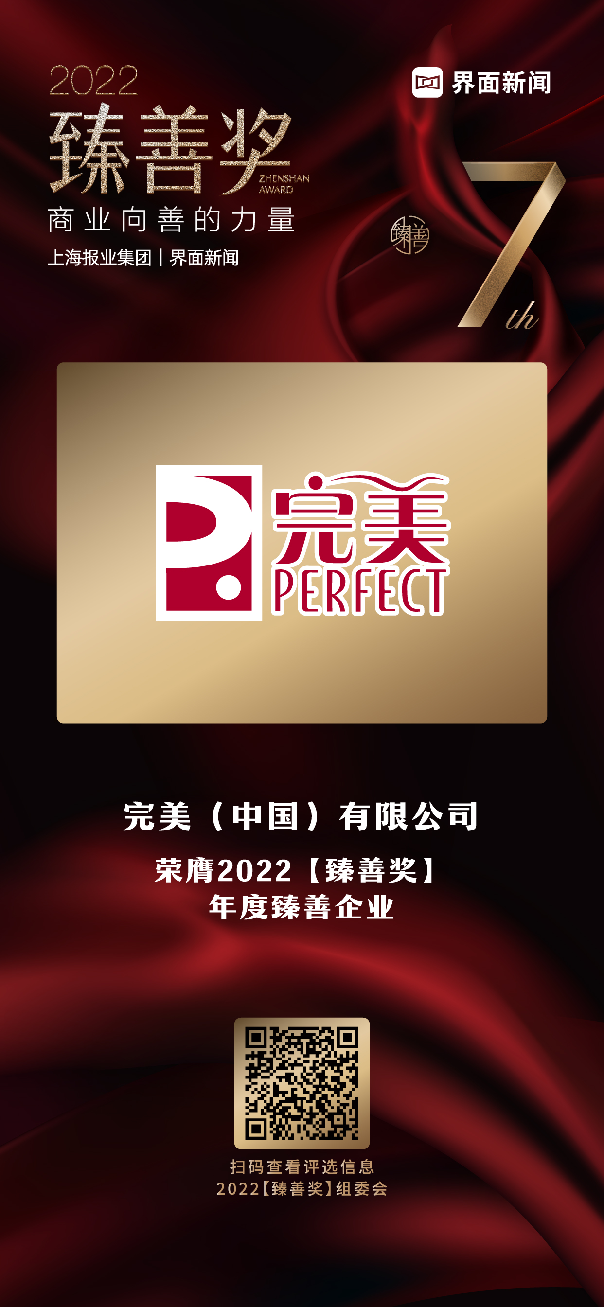 12月21日,上海报业集团 | 界面新闻在上海中心举办了2022【臻善奖】颁奖典礼,并正式公布了本年度获奖名单。聚“商业向善”之力,本届【臻善奖】吸引了一大批在公益慈善领域有所贡献的优秀企业和公益人士参与。完美(中国)有限公司积极践行社会责任,推动社会高质量发展,荣膺年度臻善企业。