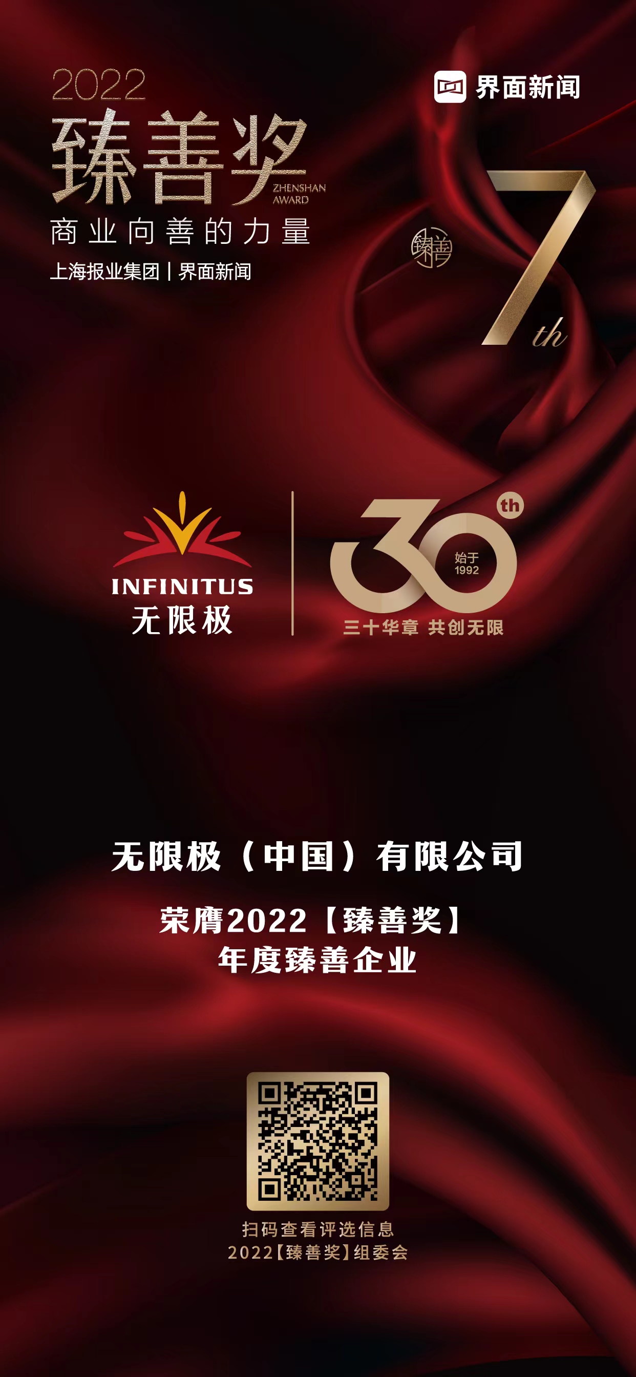 12月21日,上海报业集团 | 界面新闻在上海中心举办了2022【臻善奖】颁奖典礼,并正式公布了本年度获奖名单。聚“商业向善”之力,本届【臻善奖】吸引了一大批在公益慈善领域有所贡献的优秀企业和公益人士参与。无限极(中国)有限公司不断拓宽社会责任边界,持续为社会创造价值,荣膺年度臻善企业。