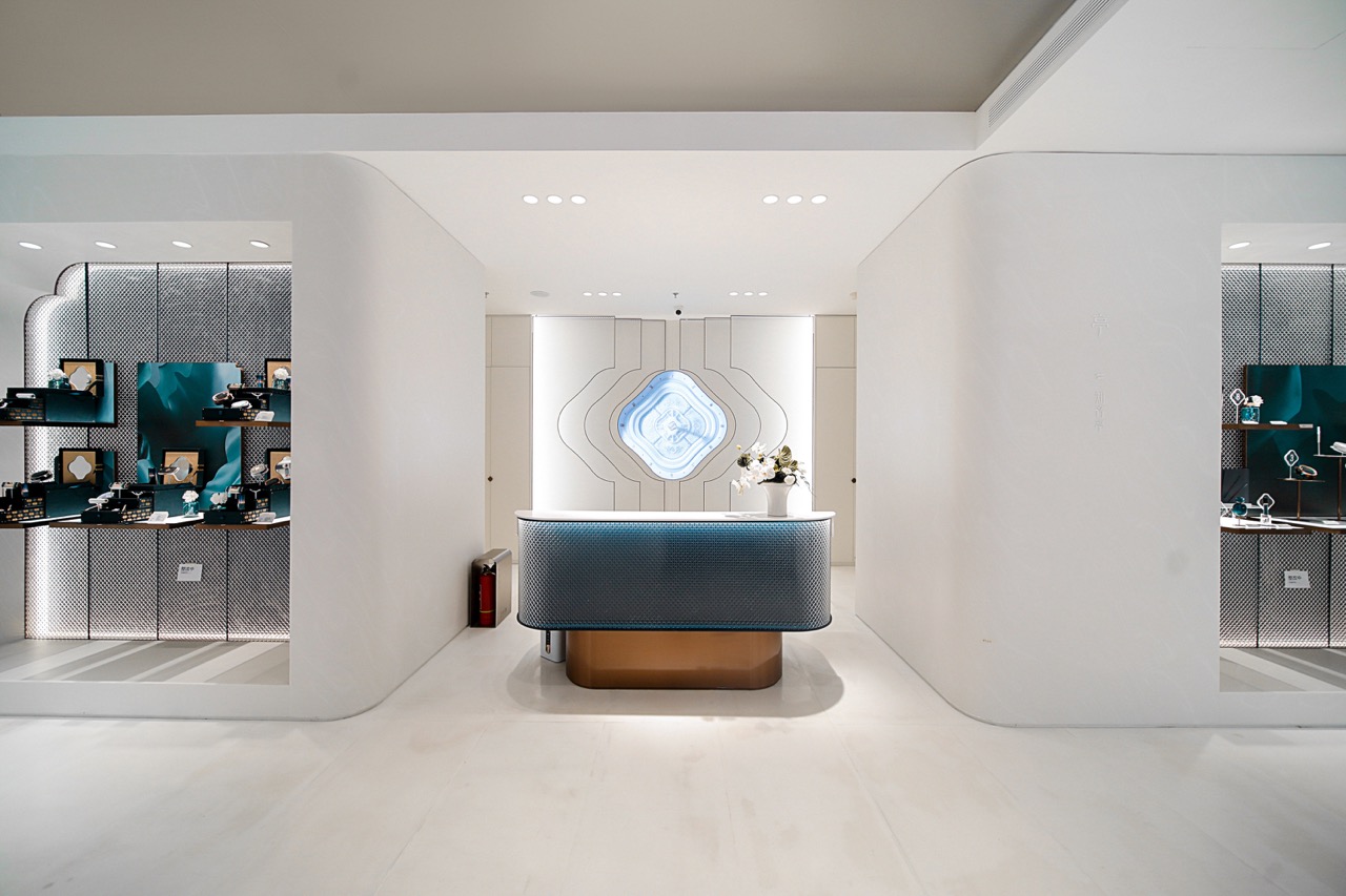 花西子隐园的灵感亦来源于“中国园林”。在空间分区上,隐园借鉴了传统园林中的 “内庭外院”,演化为“上庭下院”。一楼“下院”的空间较为敞亮,以零售空间与试妆区域为主。作为“上庭”的二楼空间则更为隐秘安静,主要为艺术展出、定制化体验提供空间。