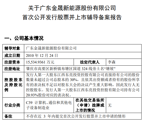 这是一家无控股股东的公司。天眼查显示,该公司由李氏五兄弟李森、李鑫、李炎、李汪、李尧各持有20%的股份。据上市辅导备案公告,金晟新能的第一大股东为江西东亮投资控股有限公司,持有金晟新能20.93%的表决权,该公司依然由五兄弟平均持股。