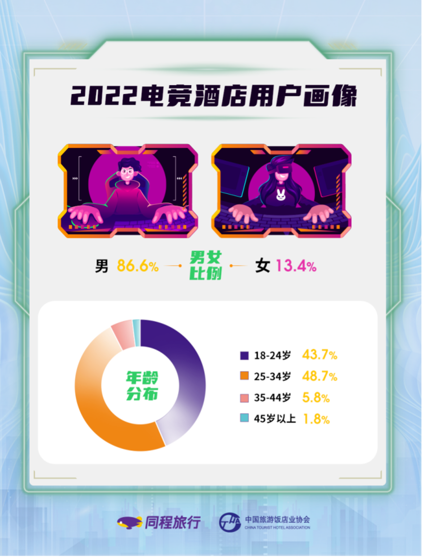 根据《2022电竞酒店市场研究报告》的预测,预计到2023年中国电竞主题酒店将突破2万家,其中,小李所在的成都位列电竞酒店消费最为活跃城市排名第一位。但报告中也提及,目前已经存在的电竞酒店中,专业电竞酒店的占比为36%,普通酒店叠加电竞元素的占比为64%,从消费客群构成上,25-34岁用户的用户最多,占比48.7%,其次才是18-24岁用户,占比在43.7%左右。