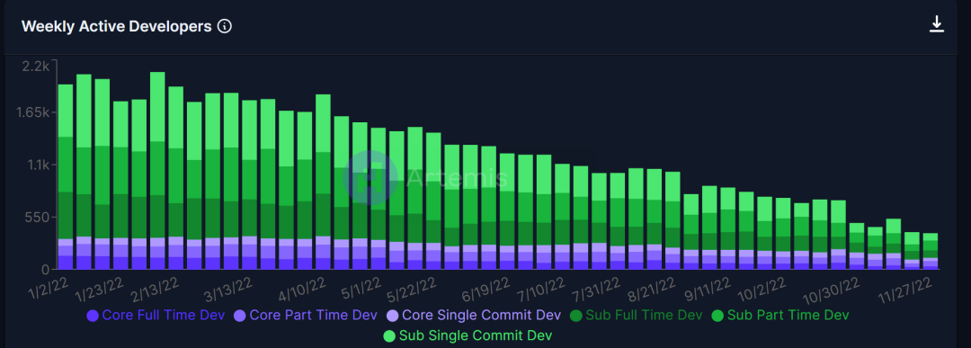 在SBF影响下,Solana 不仅成为仅次于以太坊和BSC的合约公链,同时也成为最大的一条非EVM公链,链上TVL一度高达百亿美元,无论是链上活跃度还是开发者数量都展示了极大的活力。但在FTX暴雷后,Solana 链上生态开始雪崩,DeFi项目接连出现流动性危机,坏账不断聚集,NFT 引发抛售潮等等,不少项目TVL几乎一夜归零。此外,近一年以来,Solana 链上的活跃开发者也持续流失,目前,无论是核心开发者数量,还是子生态系统开发者,相比年初都减少了80%以上。