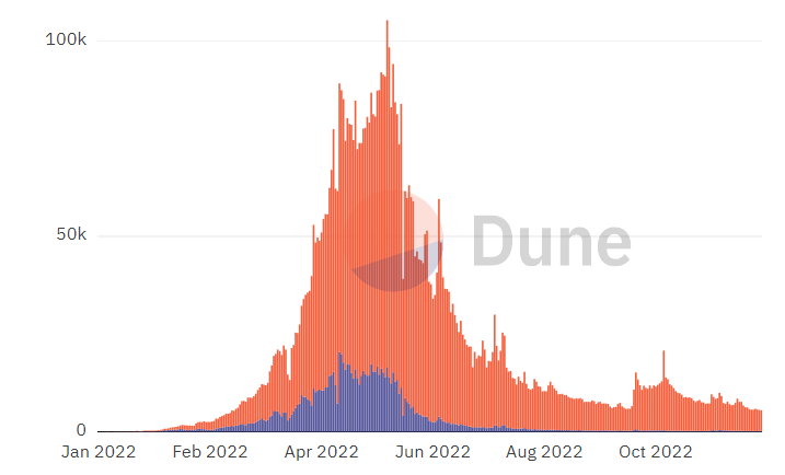 根据 dune 上的统计显示,目前 StepN 每日活跃用户还不到5千,仅有巅峰时期5%左右,其中Solana 链上的活跃用户更是仅有一百人,这个发迹于 Solana 链上 X-to-Earn 链游,如果不是BNB链上还维系着基础的用户,或许早已凉透。