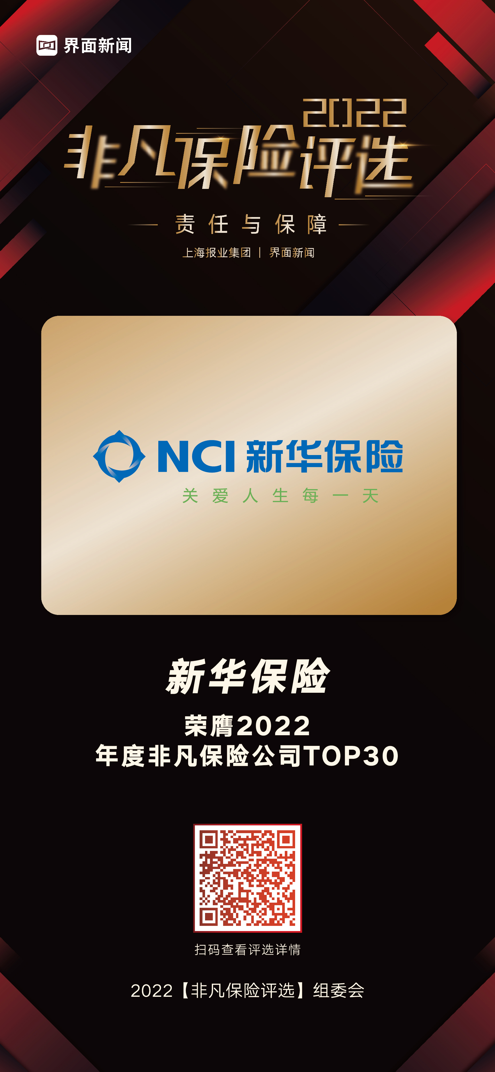 12月20日,由上海报业集团|界面新闻主办的2022【非凡保险评选】颁奖典礼在上海成功举办,新华保险上榜2022【非凡保险评选】年度非凡保险公司TOP30。