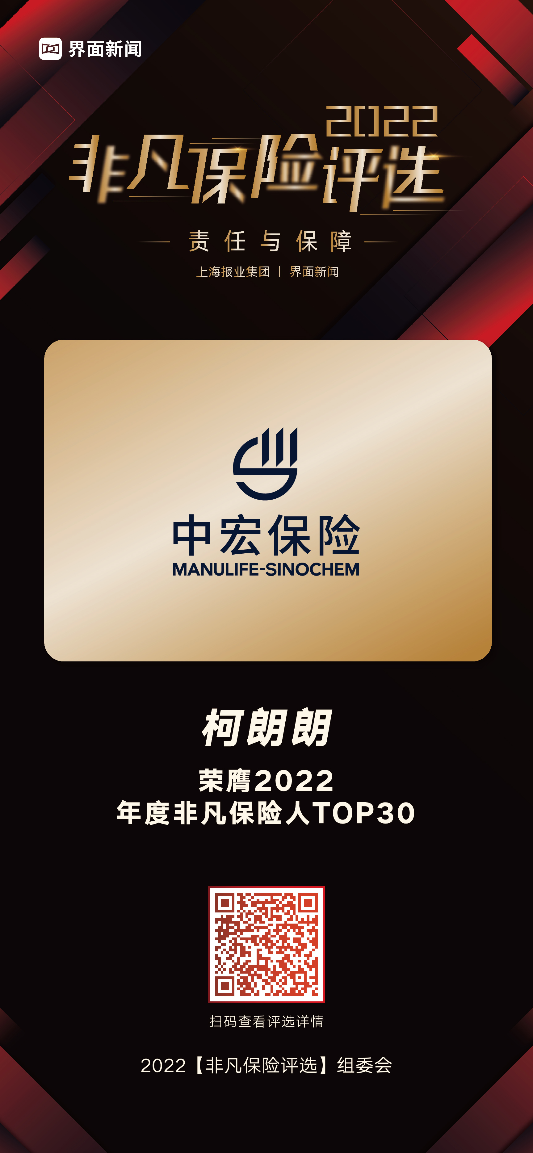 12月20日,上海报业集团|界面新闻主办的2022【非凡保险评选】颁奖典礼在上海成功举办,中宏保险丁芬、唐迎军、徐稷杨、张金萍、柯朗朗、陈晓曦上榜2022【非凡保险评选】年度非凡保险人TOP30。