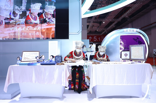 在2021年进博会期间,如新邀请了两位贵州职业学院的受益女生来到如新展台,现场分享她们亲手制作的非遗工艺作品。