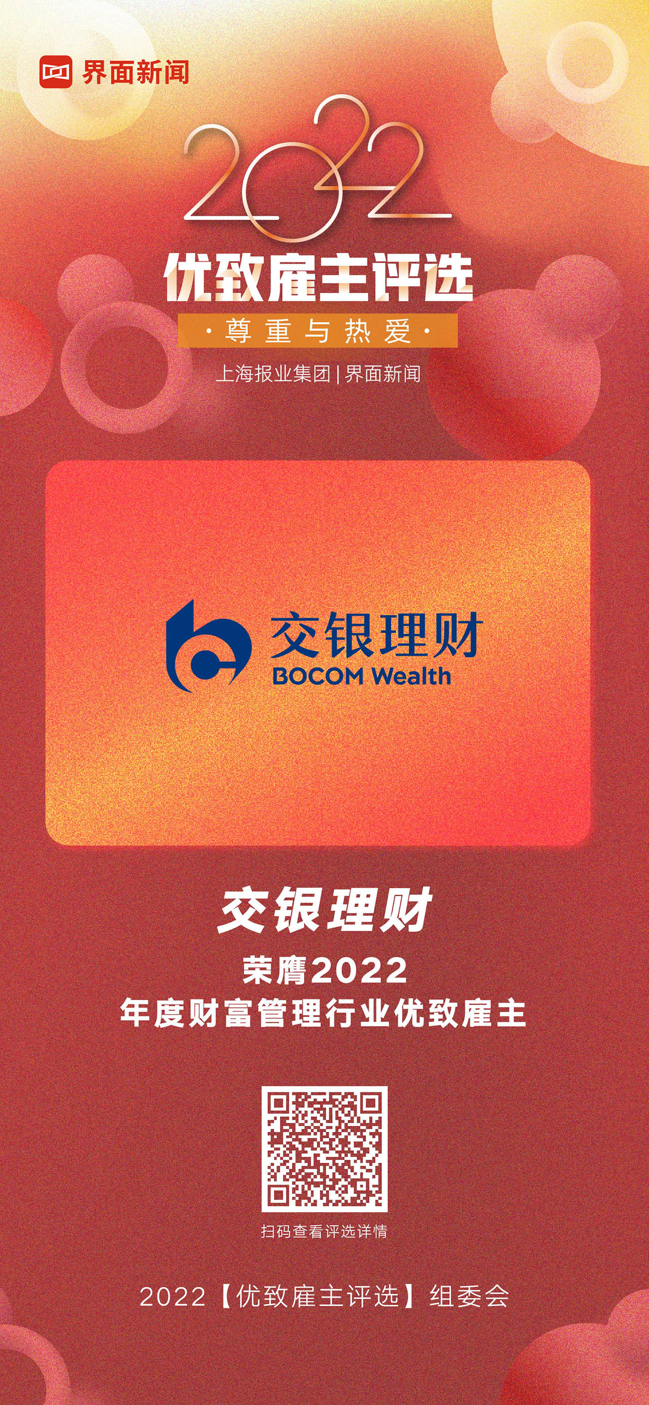 12月20日,上海报业集团l界面新闻在上海举办了2022【优致雇主评选】颁奖典礼,隆重公布本年度获奖名单。围绕寻找和评选最佳雇主这一责任旨归,以独立客观立场,通过专业科学的调查和评估体系,洞察求职者的需求变化,同时为求职者发现“好雇主”提供有效参考,实现雇主与雇员的“双赢”,各行各业的优秀企业均踊跃参加。交银理财凭借创新的企业文化和管理模式,荣获2022【优致雇主评选】年度财富管理行业优致雇主。
