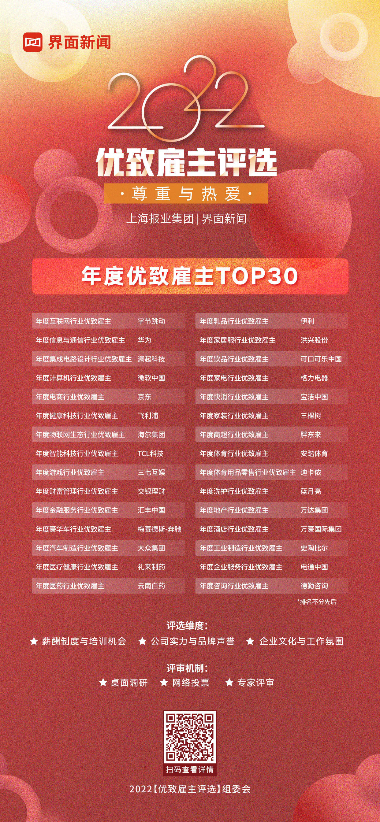 经过前期桌面调研、网络投票、专家评审意见等环节,2022【优致雇主评选】榜单正式公布,一起见证荣誉时刻!