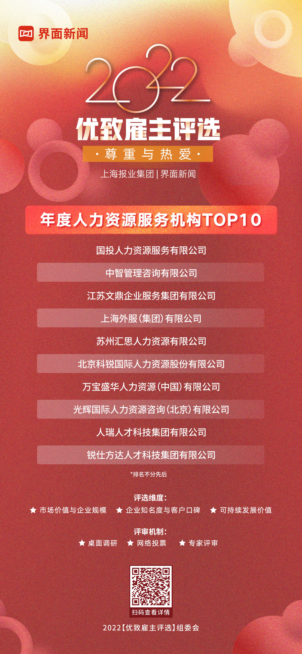 以下为2022【优致雇主评选】-年度人力资源服务机构TOP30: