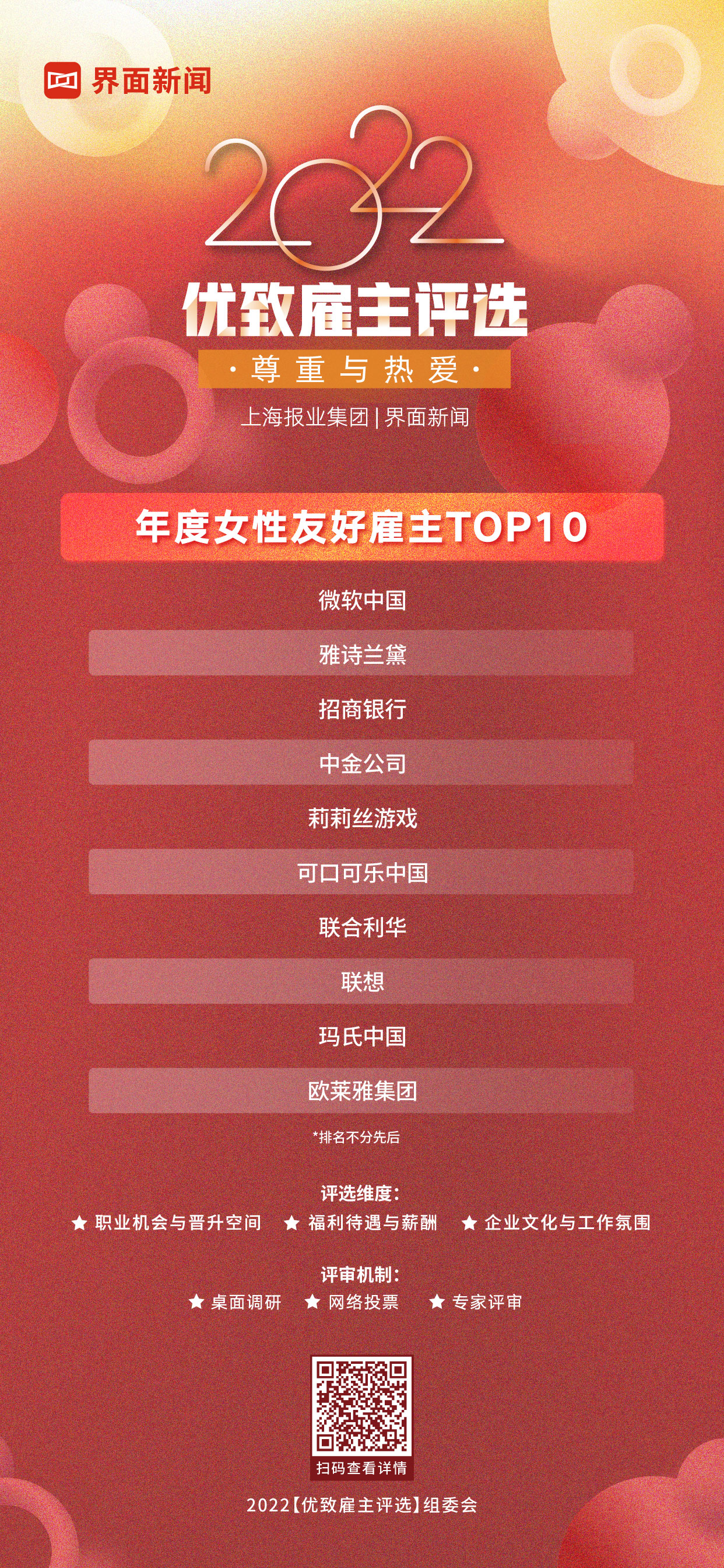 以下为2022【优致雇主评选】-年度女性友好雇主TOP10: