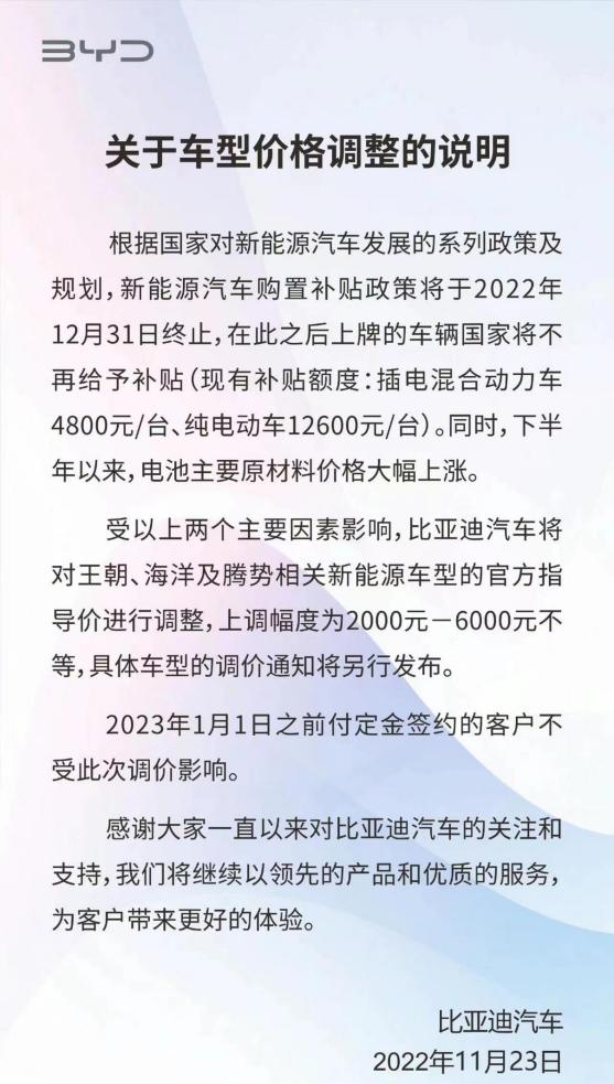 11月23日,比亚迪率先宣布,受新能源购置补贴政策将于2022年12月31日终止和电池原材料价格上涨影响,将对王朝、海洋及腾势相关新能源车型官方指导价上调2000-6000元,并强调2023年1月1日之前交付定金签约的客户不受此次调价影响。