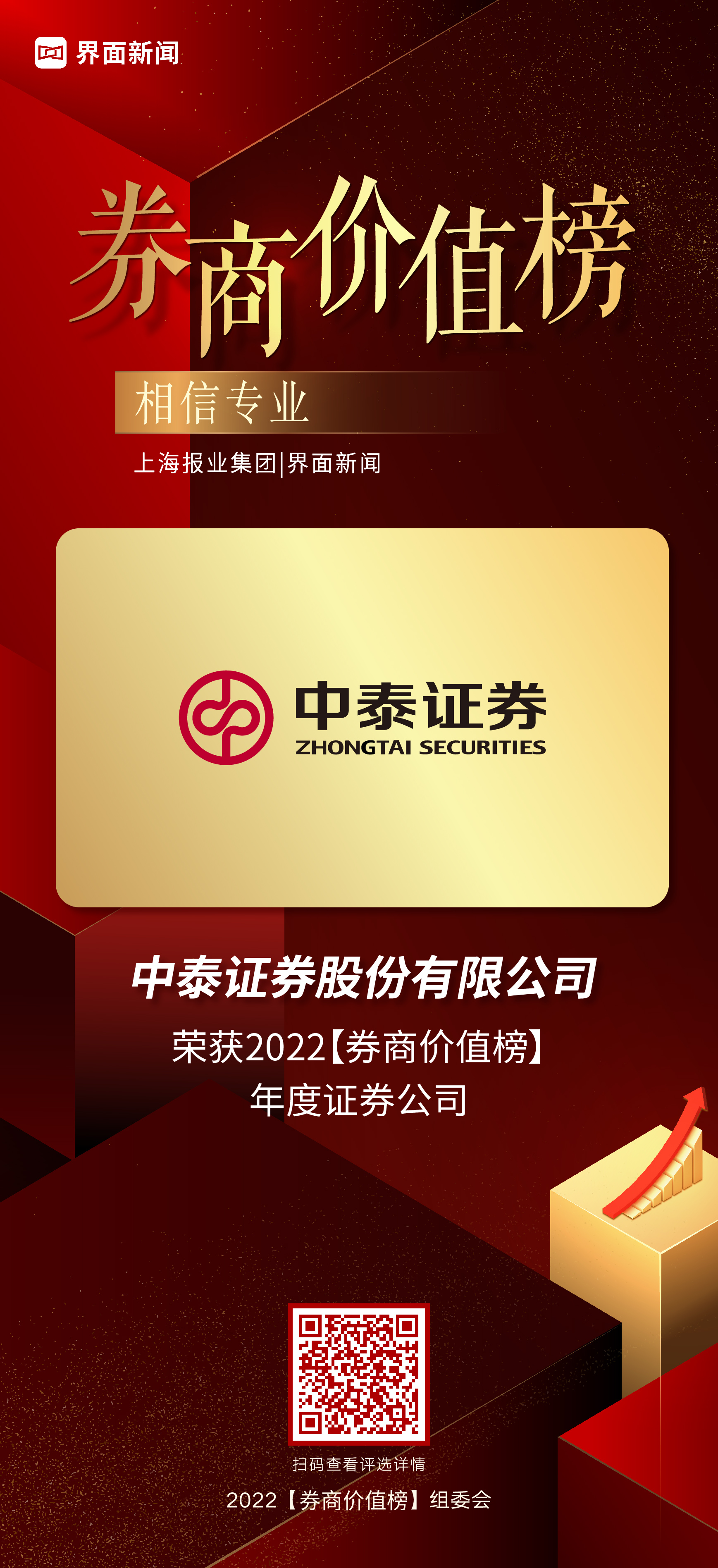 中泰证券股份有限公司凭借对建设资本市场的贡献,荣膺【2022券商价值榜】年度证券公司。