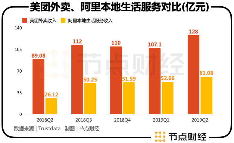 履约效率不同在业绩上的体现是,饿了么的收入规模始终低于美团。在2018Q3(饿了么于Q2被收购),美团外卖的收入超过110亿元,阿里本地生活业务的收入刚超过50亿元,被收购一年后,双方的差距拉大到60亿元左右。饿了么在这期间保持了增长,但已经追不上美团,这个情况一直持续至今。