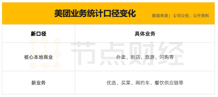 与此同时,目前占有优势的美团重新划分了业务的统计口径。原来按照业务性质划分的餐饮外卖、到店、酒店及旅游、新业务及其他,变成了核心本地商业和新业务两大板块。