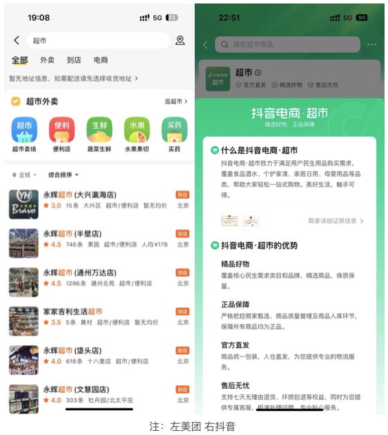 具体来说,抖音的本地商流还不够强,节点财经了解到其本地服务还处于前期测试阶段。目前,用户想要在抖音中享受和美团或者饿了么平台中的“30分钟到家”服务,一种方式是进入第三方的小程序,如与抖音官方合作的饿了么。另一种是身处已经开通试点的城市,抖音在今年10月才开始进行超市类的招商,首批试点地区为深圳、广州、惠州、东莞。