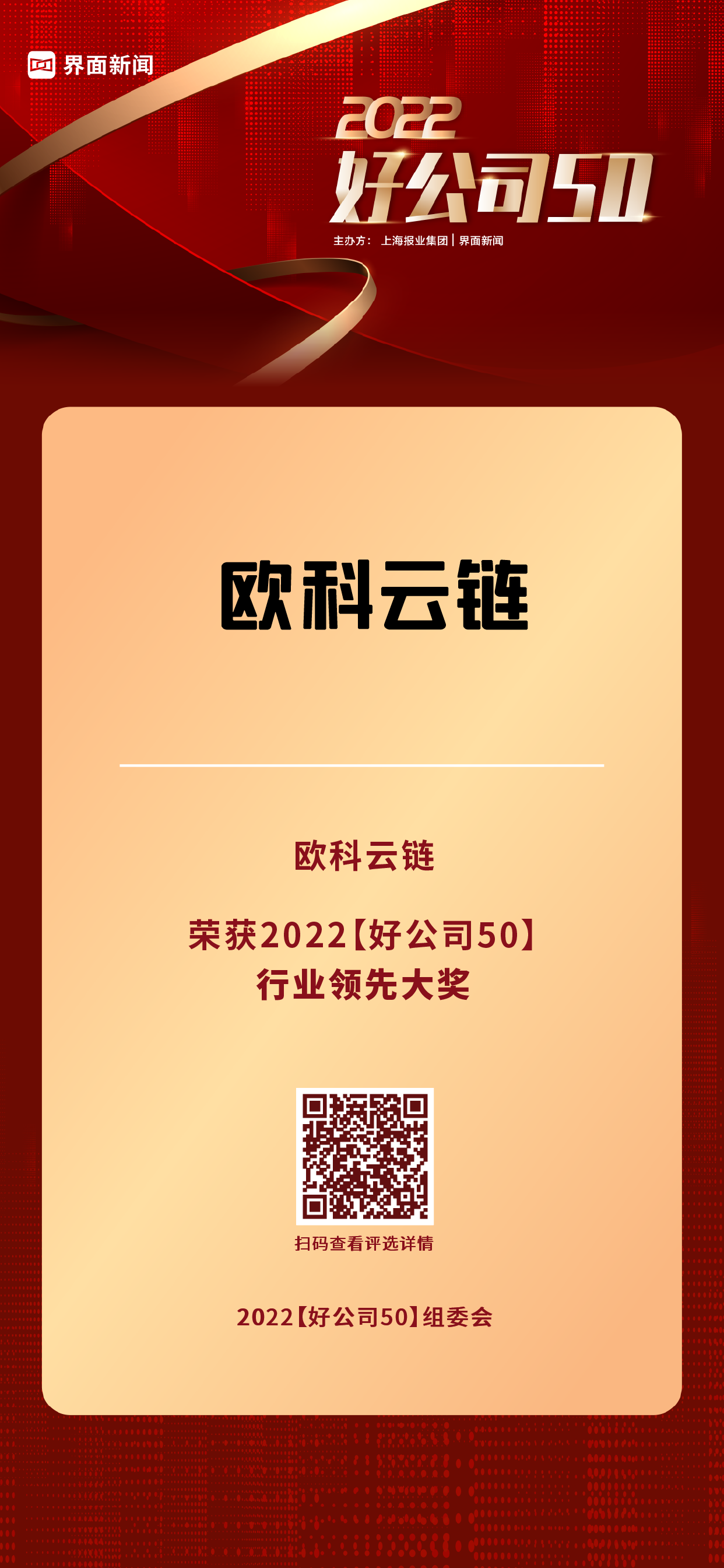 12月20日,上海报业集团|界面新闻在上海中心举办了【2022好公司50】颁奖典礼,正式公布了本年度的获奖名单。评选自今年7月正式启动申报以来,来自39个细分行业的500余家候选公司,经过近半年的大众投票、市场表现、创新活力、公司治理、社会声誉等方面的角逐,最终50家优质企业突破重围荣登年度荣誉榜单。欧科云链,全球领先的区块链技术领航者,致力于区块链技术的研发与商用,荣膺【2022好公司50——行业领先大奖】。