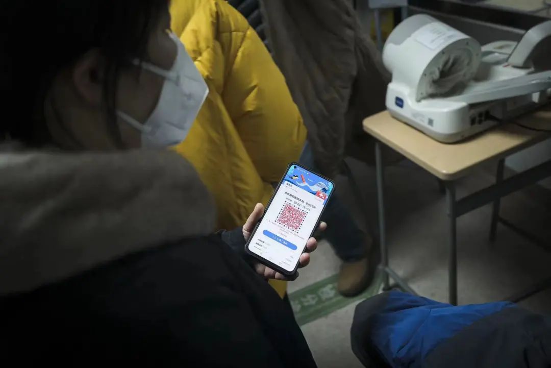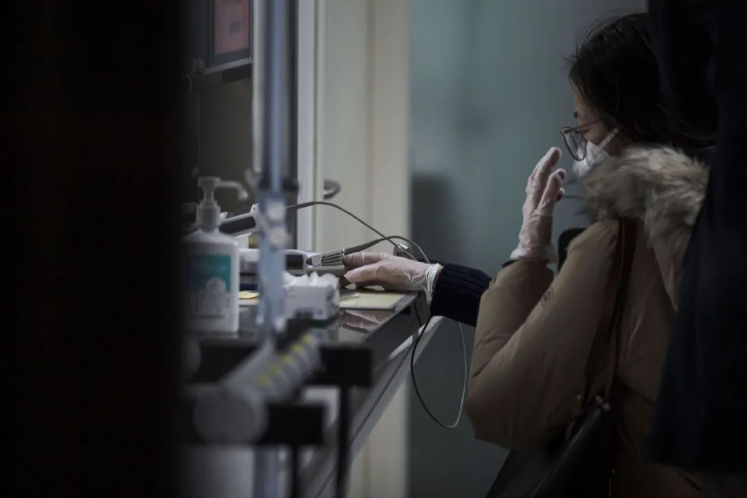 ▲ 取号前,人们需要排队登记、测体温、血氧等。门外,气温只有零下5度。