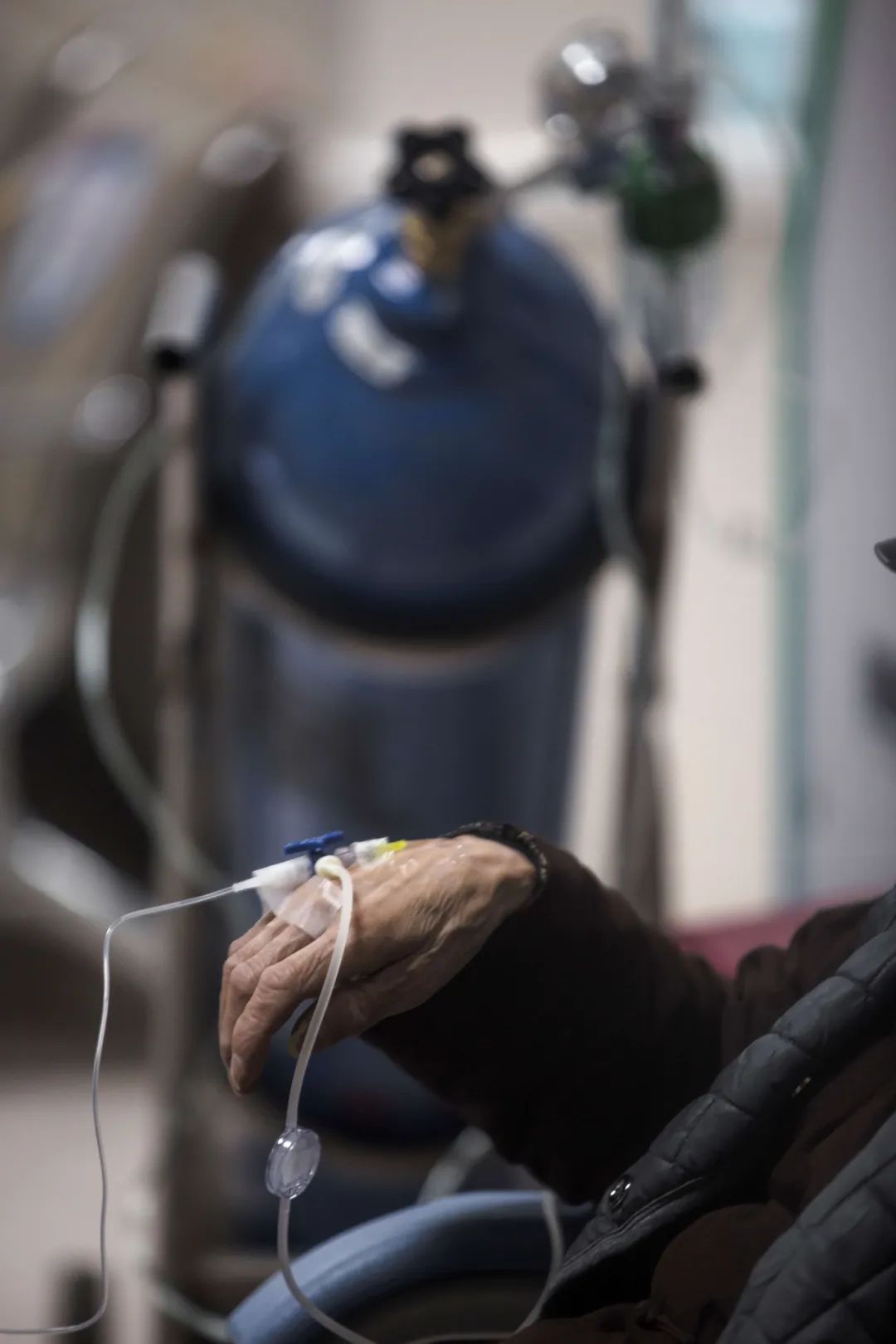 ▲ 一位老人正在输液,他手上的皮肤彰显出他的衰老。