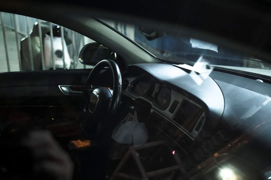 ▲ 停在发热门诊前的私家车,方向盘上挂满了N95口罩。