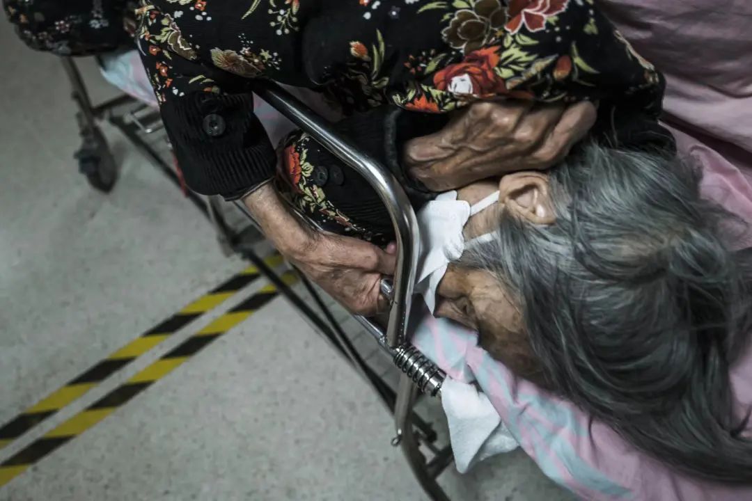 在这里,你的每个转身,都能看见担架上昏睡不醒的老人——没有病床之后,老人们被放置在角落,电梯口、厕所口、任何一个狭窄的空地,让他们得以撑下去的,是一个个小火箭形状的蓝色氧气筒。急诊室门外,还有救护车源源不断地开过来,放下新的患者,再把狭小的封闭空间填得更满。