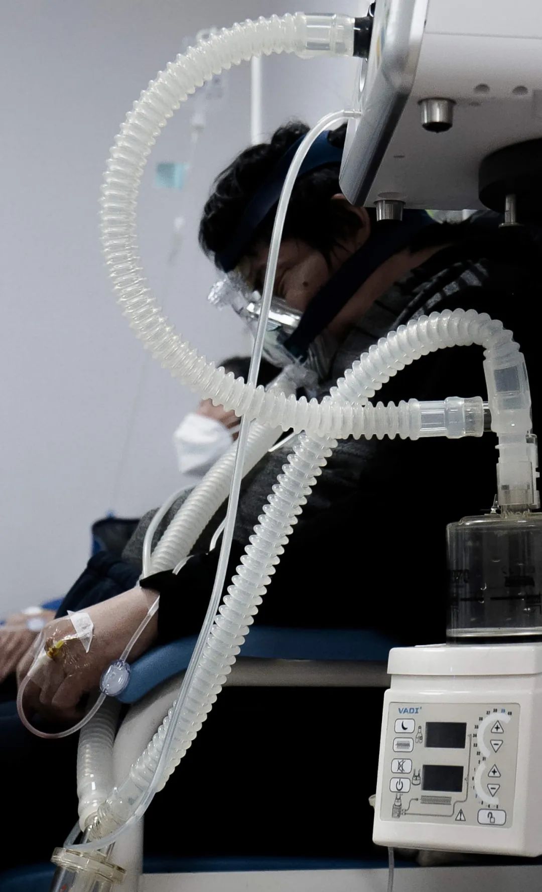 ▲ 一位患者正在使用呼吸机。董晨给父亲看病时,医生告诉他,自己有十几位患者都在使用呼吸机,但也难以进入地坛医院。