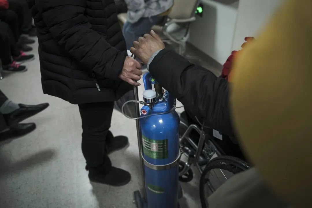 ▲ 输液时,很多人身边放着蓝色的氧气筒。