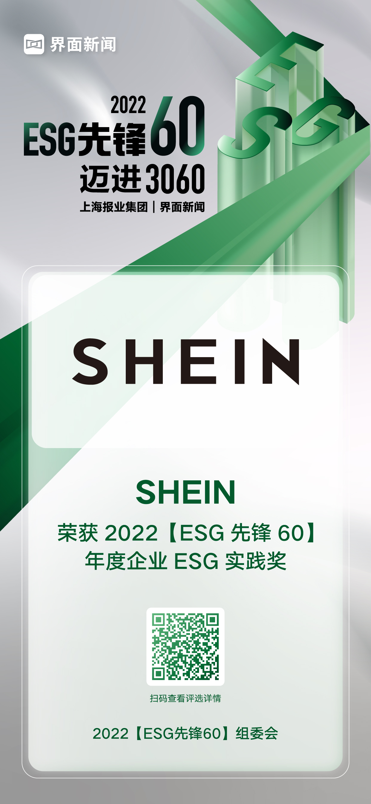 12月20日,上海报业集团|界面新闻在上海中心举办了2022【ESG先锋60】颁奖典礼,并正式公布了本年度获奖名单。在这项万众期待的关于ESG议题的年度评选中,来自各行各业的绿色先锋企业与先锋探索人物,凭借年度市场表现与行业影响力,获得年度大奖。其中,SHEIN凭借其在行业内的优异表现,荣膺年度企业ESG实践奖。