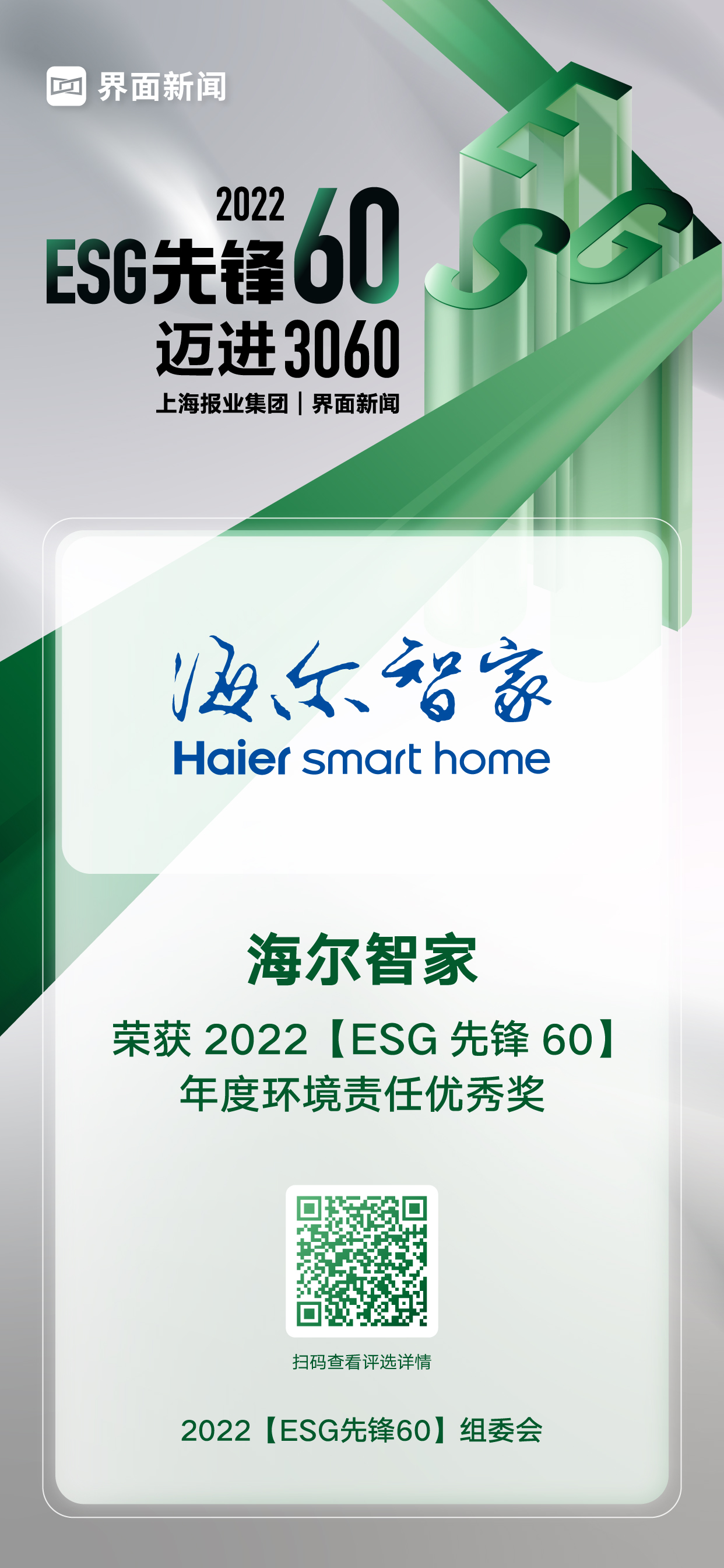 12月20日,上海报业集团|界面新闻在上海中心举办了2022【ESG先锋60】颁奖典礼,并正式公布了本年度获奖名单。在这项万众期待的关于ESG议题的年度评选中,来自各行各业绿色先锋企业与10位先锋探索人物,凭借年度市场表现与行业影响力,获得年度大奖。其中,海尔智家凭借其在行业内的优异表现,荣膺年度环境责任优秀奖。