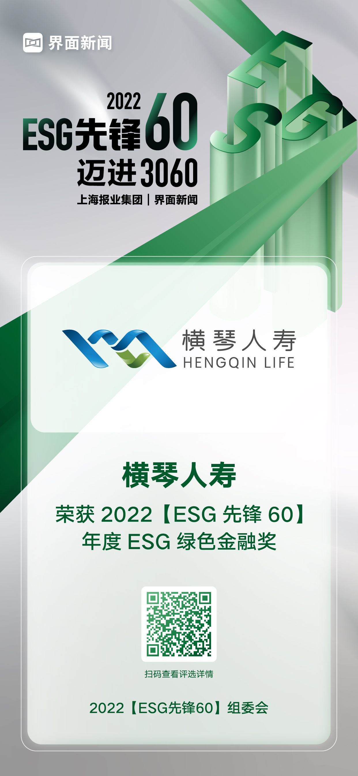 12月20日,上海报业集团|界面新闻在上海中心举办了2022【ESG先锋60】颁奖典礼,并正式公布了本年度获奖名单。在这项万众期待的关于ESG议题的年度评选中,来自各行各业的绿色先锋企业与先锋探索人物,凭借年度市场表现与行业影响力,获得年度大奖。其中,横琴人寿凭借其在行业内的优异表现,荣膺年度ESG绿色金融奖。