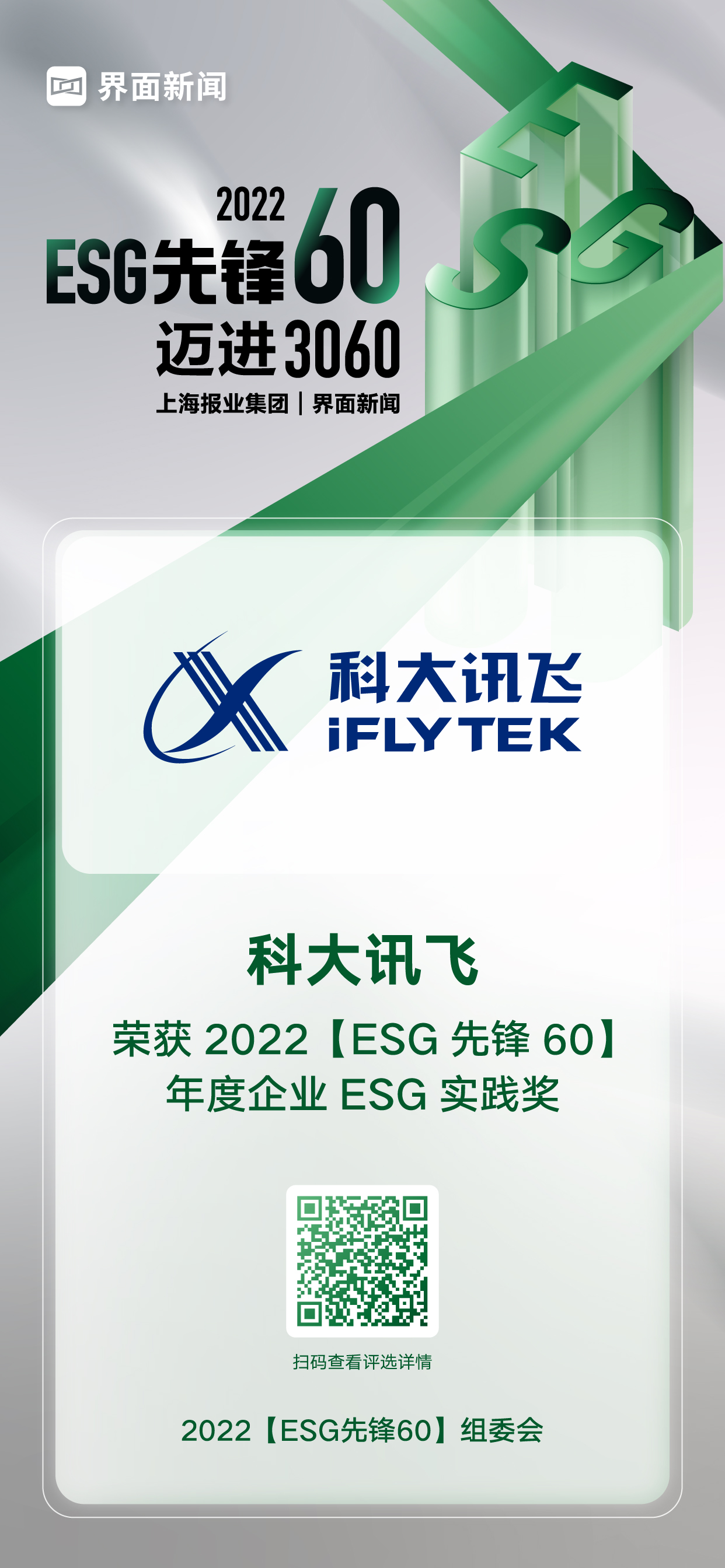 12月20日,上海报业集团|界面新闻在上海中心举办了2022【ESG先锋60】颁奖典礼,并正式公布了本年度获奖名单。在这项万众期待的关于ESG议题的年度评选中,来自各行各业的绿色先锋企业与先锋探索人物,凭借年度市场表现与行业影响力,获得年度大奖。其中,科大讯飞凭借其在行业内的优异表现,荣膺年度企业ESG实践奖。