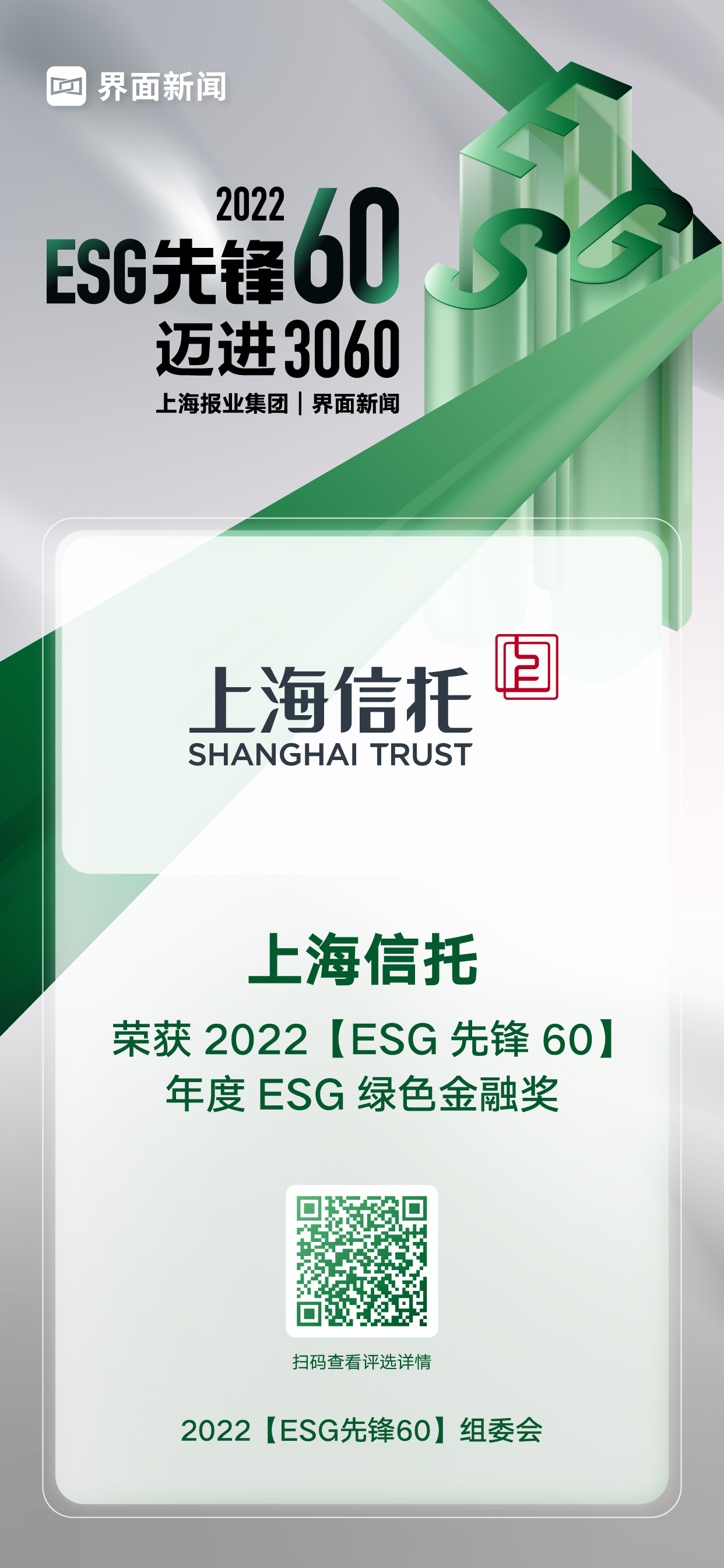 12月20日,上海报业集团|界面新闻在上海中心举办了2022【ESG先锋60】颁奖典礼,并正式公布了本年度获奖名单。在这项万众期待的关于ESG议题的年度评选中,来自各行各业的绿色先锋企业与先锋探索人物,凭借年度市场表现与行业影响力,获得年度大奖。其中,上海信托凭借其在行业内的优异表现,荣膺年度ESG绿色金融奖。