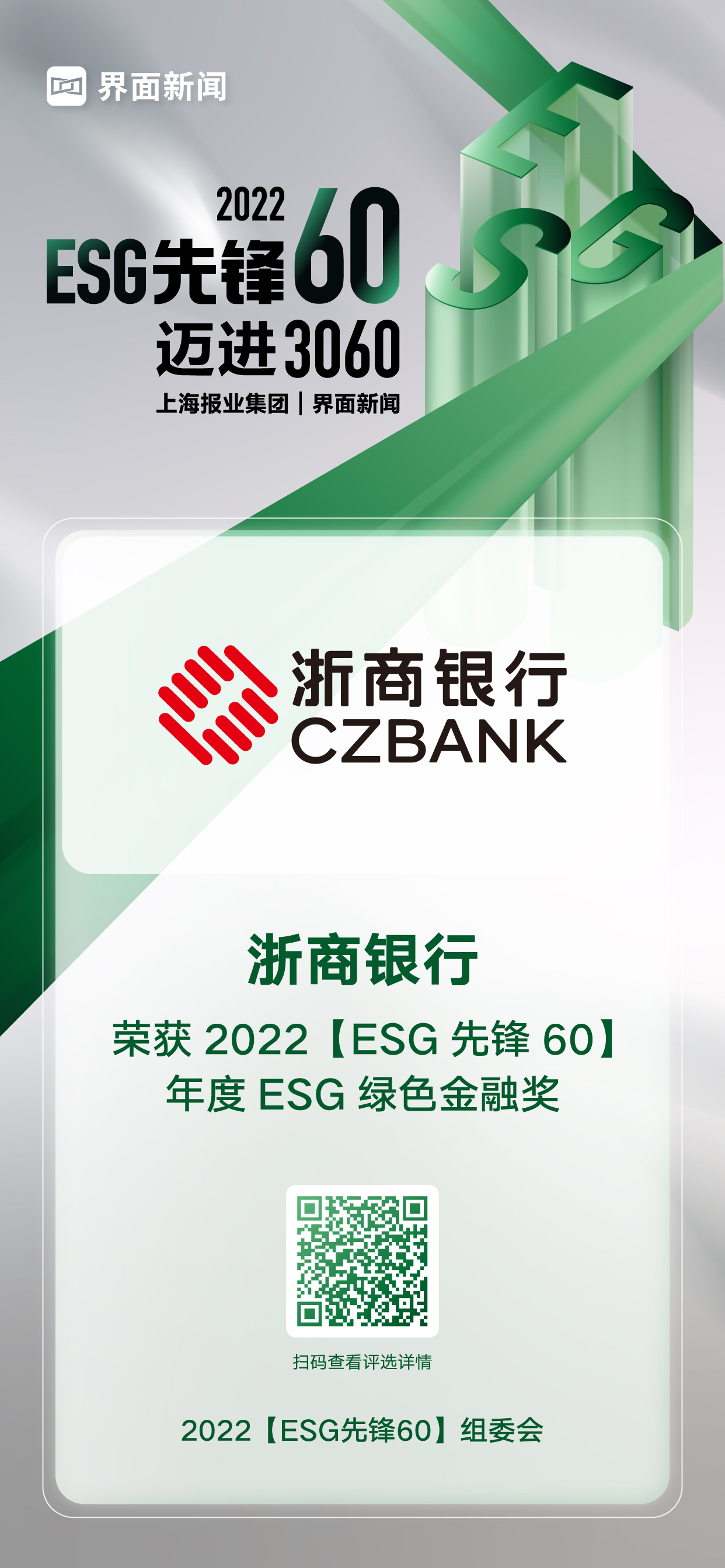 12月20日,上海报业集团|界面新闻在上海中心举办了2022【ESG先锋60】颁奖典礼,并正式公布了本年度获奖名单。在这项万众期待的关于ESG议题的年度评选中,来自各行各业的绿色先锋企业与先锋探索人物,凭借年度市场表现与行业影响力,获得年度大奖。其中,浙商银行凭借其在行业内的优异表现,荣膺年度ESG绿色金融奖。